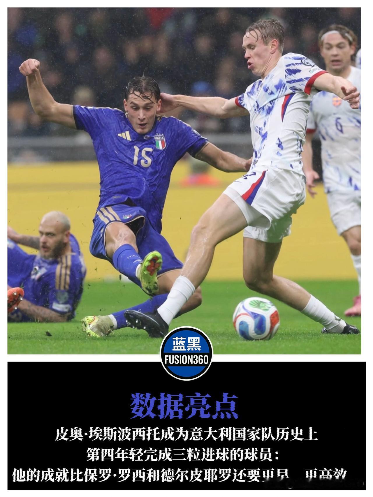 埃斯波西托超越德尔皮耶罗和罗西!成意大利第四年轻三球王 埃斯波西托又刷新历史纪录。在对阵挪威的比赛中打进第3粒国家队进球,年仅20岁的他成为意大利历史上第四年轻完成三球里程碑的球员,前面只有梅阿查、科尔索和里维拉三位传奇 。他比德尔皮耶罗和保罗·罗西这两位意大利足球偶像更早达成这一成就。 埃斯波西托在梅阿查打破进球荒,这座国米主场终于见证了他的首粒意大利国家队进球。虽然意大利1-4惨败挪威,但小将的个人表现可圈可点,继续证明自己配得上蓝衣军团战袍。 埃斯波西托能成为下一个罗西吗?国际米兰 💙🖤