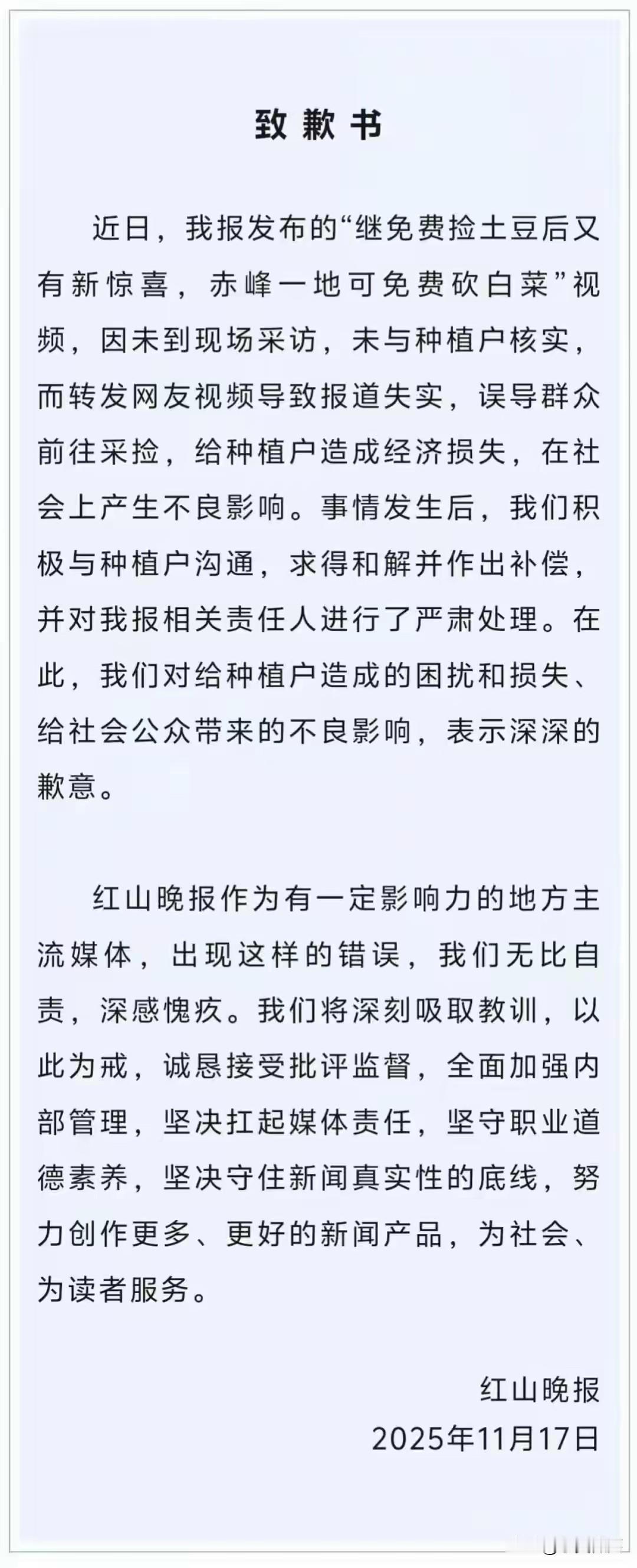 自媒体博主随意发表也就罢了,《红山晚报》也跟着起哄,随意把视频拿来,不加甄别,想当然的就发表,造成不良社会影响。 晚报记者足不出户,不出办公室,不深入田间地头,不与农户沟通交流,就凭几个电话,“新闻”就出炉了。 《红山晚报》是赤峰日报下属子报,号称全国第一家县级晚报。 报社也道歉了,记者也被严厉处罚了,报社相关责任人也被处分了。