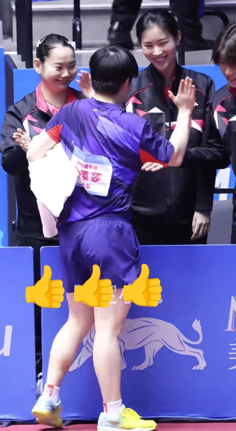 莎莎团体打进决赛了!太牛了! 这次莎莎真的是立大功了,这一天打的都是一单,可累坏这个宝宝了,这是刚刚赢了黑龙江队和队友击掌的一瞬间,只看何卓佳和王添艺高兴的,笑容满面的和莎莎击掌庆祝,这次莎莎的队友不拉胯,虽然她打一单,但是每次只打一场就结束了,队友给力,莎莎保存体力 这几天在澳门莎莎累坏了,每天高强度的训练和比赛,估计又要瘦几斤了,明天就要决赛了,目前发文时间对阵名单还没有出来,不是上海就是山东,期待明天决赛上她的精彩表现!