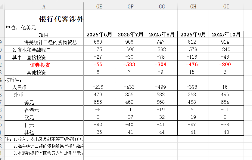 根据外管局公布的银行代客涉外收付款数据(以美元计值)十月份证券投资老外抛出的速度下降了,只抛了200亿美金,相对于7、8、9月份有明显的下降,可能是10月份行情不太好,不太好抛