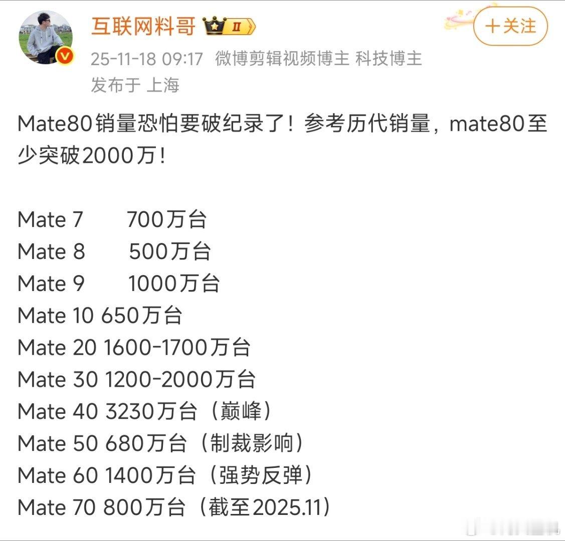 互联网料哥:卧草,华为pura80系列销量要破纪录。结果华为80系列销量遭遇滑铁卢,不如上代。如今料哥再来毒奶,文案惊人的一致。有的时候还挺玄学,不禁让人为华为Mate80系列的销量捏把汗。
