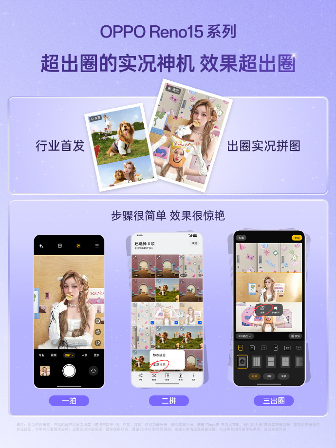 继蝴蝶紫、人鱼姬之后,系列又推出了一个星光蝴蝶结,颜值和拍照这块太会拿捏女生了。高亮冰透玻璃星光镜组,全息光刻工艺的裸眼3D蝴蝶结效果,金属中框,6.32英寸187g轻薄小尺寸,潮流女大的出街单品自Reno12系列靠安卓实况出圈,OPPO便在这个赛道越走越强。2亿像素超清主摄加5000万像素超广角、潜望长焦、前置超广角,前后置自拍都清晰。拍实况除了支持前后同拍实况照片、CCD闪光实况照片、多色补光实况自拍,还有实况拼图的新玩法,一拍二拼三出片。