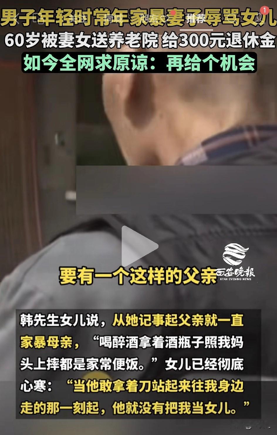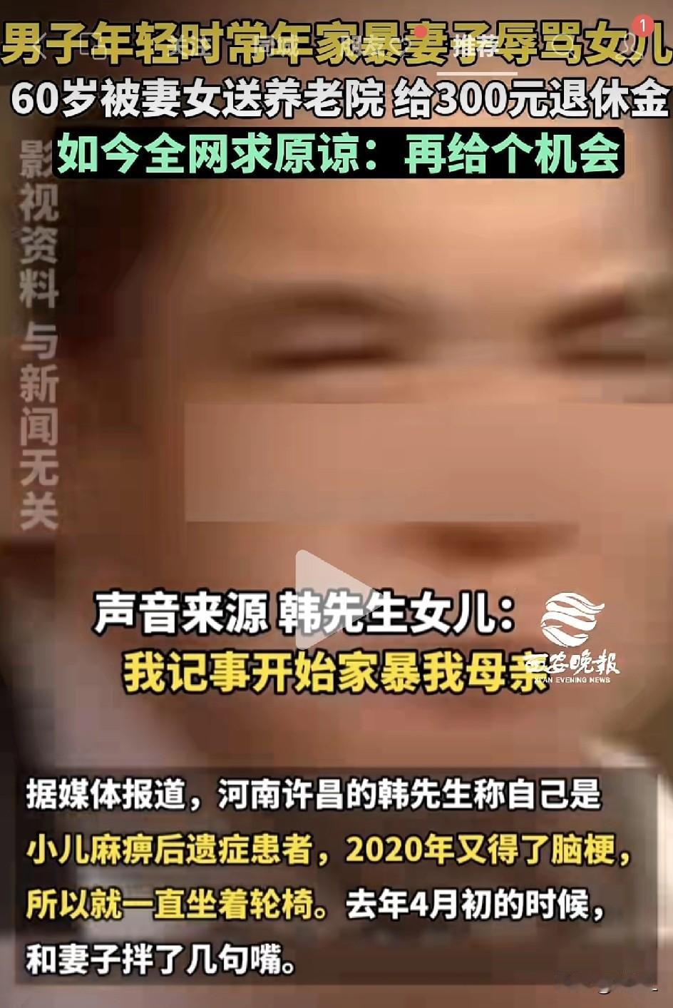 “他哪里是知道错了,分明是打不动了!”六旬家暴男被妻女送进养老院,全网喊话求原谅。妻女:永不原谅! 近日,河南许昌六旬男子韩某,因为家庭琐事被妻子当众掌掴,并于一周后被妻女送进了养老院。每月2200元的退休金,仅给600元,并于第二月减至300元。 韩某在全网公开向妻女喊话,“永远不可能再骂俺老婆一句,动俺老婆一指头。”求妻女原谅,要回归家庭。 乍一听,感觉韩某挺可怜的,人到暮年,被妻女送进养老院,回归家庭无门,连退休金每月只有区区300元可以支配。 但随着韩某女儿的回应,才知可怜之人必有可恨之处! 韩某是小儿麻痹后遗症患者,2020年得了脑梗,从此就依赖轮椅生活。 韩某女儿说,韩某年轻时长期对母亲实施家暴,包括醉酒后用酒瓶砸头、持刀威胁“先杀女儿再杀妻子”等暴力行为。家暴贯穿其成长过程,母亲长期隐忍,家庭关系充满恐惧与创伤。 网友说,他哪里是知道错了,分明就是打不动了,才不得不服软! 更有人说,没必要原谅他,他根本不值得,妻女在他脑梗后照顾了5年才将他送进了养老院,早已仁至义尽! 大部分人都支持韩某妻女的选择,妻女亦称自己此举是“迟到的自我救赎”,拒绝原谅。 而把韩某送进养老院,其实是最佳方案。妻女既未完全抛弃责任,又划定了安全边界。 即便是亲生父母,在长期暴力之下,家人亦可选择拒绝原谅。 暴力种下的恶果,可能在未来某个始料未及的时刻反噬自身。而受害者走出阴影的勇气,恰恰始于拒绝为暴力寻找合理化的借口。 信息来源于西安晚报,侵联删!