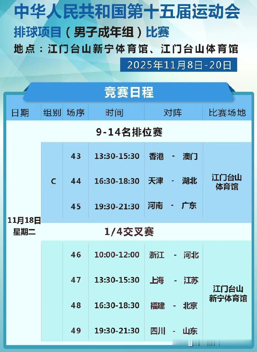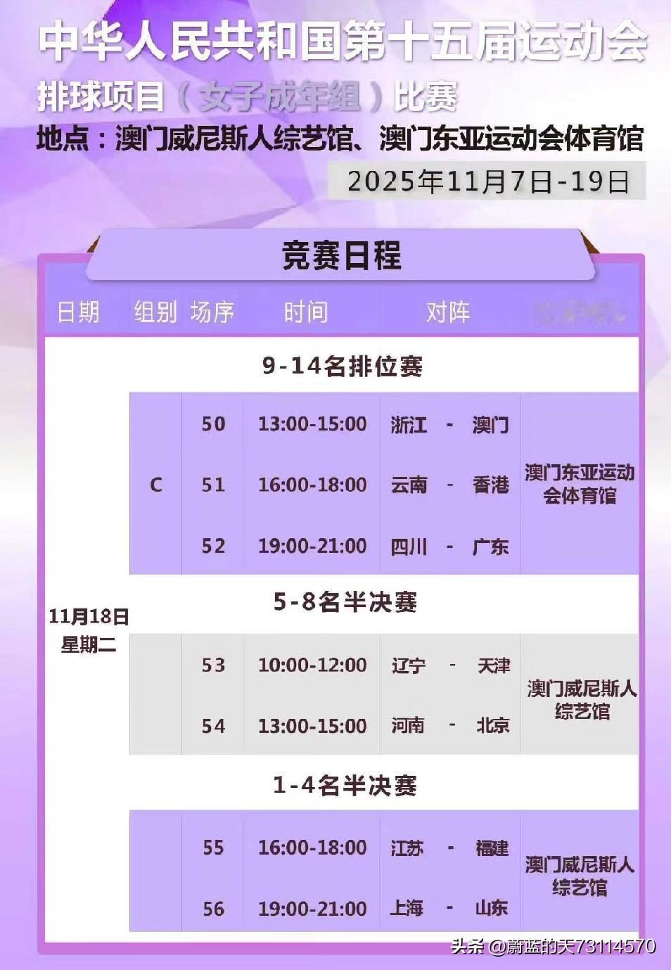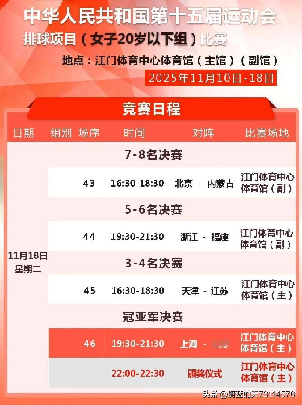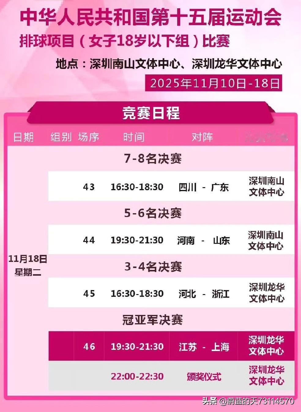 [玫瑰]正在进行的全运会排球项目进入淘汰赛阶段和奖牌的争夺战,今日(18日)战况如下: 一,成年男排1/4决赛:√ 上半区:浙江3-1胜河北,福建3-0胜北京。 下半区:上海3-0胜江苏,四川0-3负山东。 二,成年女排半决赛:√ 江苏3-0胜福建(25-14,25-13,25-19)晋级决赛。 上海0-3负山东(19-25,23-25,20-25) 三,U18女排决赛:√ 铜牌赛:河北0-3负浙江 金牌赛:江苏3-0胜上海(25-18,25-21,25-19) 四,U20女排决赛: 铜牌赛:江苏3-2胜天津 金牌赛:上海1-3负山东(26-24,22-25,24-26,27-29) 全运会之排球赛