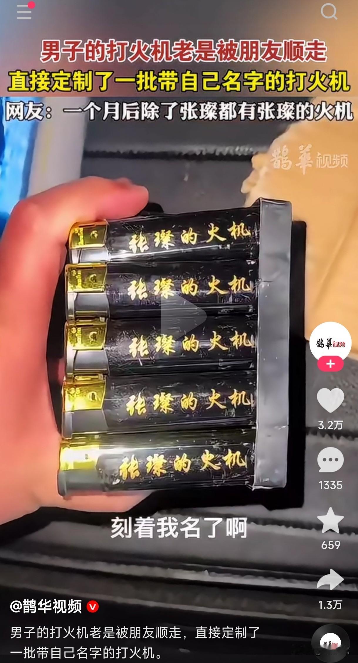 男子的打火机老是被朋友顺走,于是他直接定制了一批带有自己名字的打火机,这下是不是没人敢顺了? 虽说这廉价的打火机值不了几个钱,但是每天都丢这长年累月算下来也要一笔不小的开支,就是身上装着在贵的烟,没有这不值钱的打火机它自己也点不着啊,一年到头来丢打火机的钱,够自己好好吃一顿美食了,不过这男子定制一批带有自己名字的打火机真的可行吗? 是不是要不了多久除了他自己,所有抽烟的人都拿有带他名字的打火机?