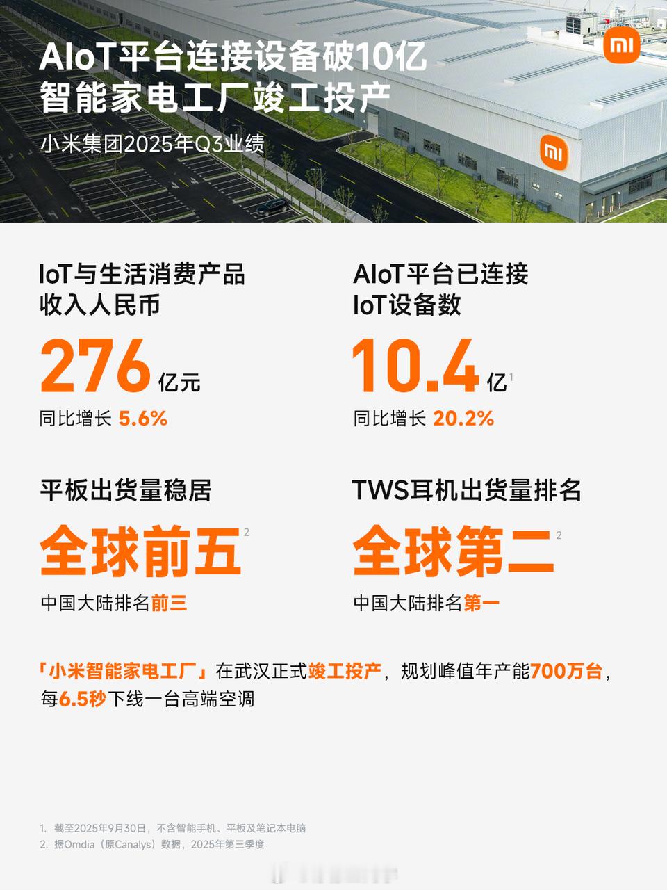 小米公布了2025年第三季度的财报,多个业务全面开花,并且在汽车业务上实现了首次单季度的经营盈利从财报看,小米已经实现了连续4个季度破千亿,利润连续3个季度破百亿,一直保持着增长状态,一片向好。其实一次两次的增长并不能说明什么,但是小米连续增长足以说明公司发展得顺利,凭实力打破了质疑在手机业务上,全球出货量已经连续9个季度同比增长,连续21个季度稳居全球前三,中国区Q3排名第二。而在汽车业务上,单季度收入已经来到了300亿,超过了不少新能源车企,交付规模也来到了50万台,等明年新车型发布后还会有一波爆发式增长在高端化进程上,手机、汽车、家电都已经实现了突破,而且AI大模型也是屡次获得突破,进入一个行业就能做到TOP级别,小米的未来发展趋势还挺明了的