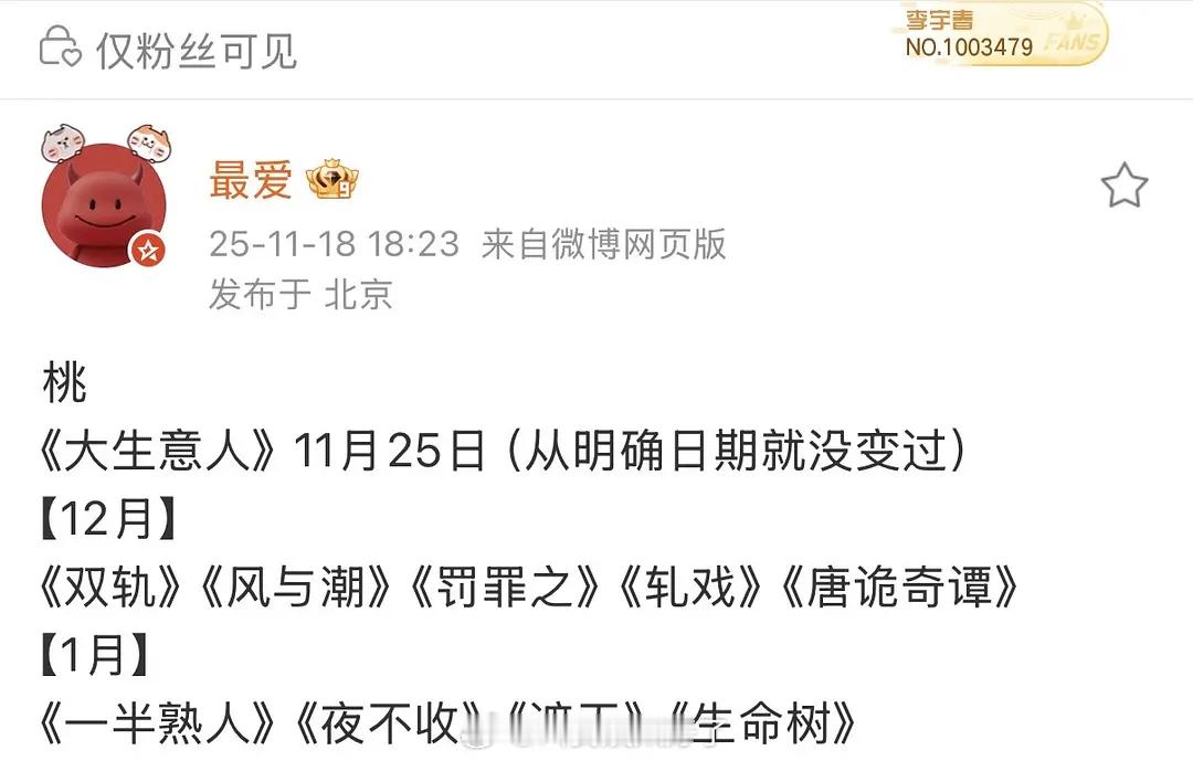 桃的排播变动好大,目前看只有《大生意人》是确定的1125,其他的都看起来不太确定,双轨12月初,轧戏12月,生命树1月