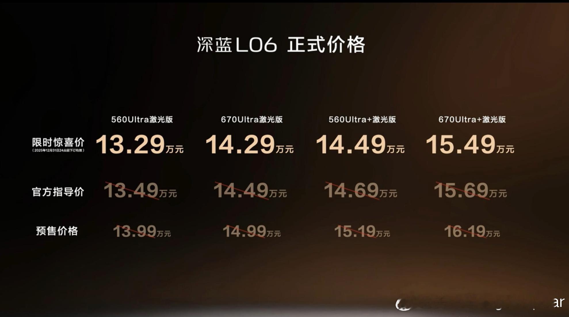 之前我发过关于深蓝L06信息,现在新车正式上市了。大家都在讨论 这确实很有意思。毕竟,新车售价区间仅为13.29-15.49万元。然后,你会发现它还全系标配激光雷达,端到端算法。甚至,它还用上了3nm座舱芯片,硬件不用说也是同级里少见的了。之前,我也试了深蓝的其他车,发现它们很喜欢后驱布局。现在的深蓝L06也是如此。底盘上还配备了磁流变悬架。这车,感觉越看越喜欢啊~~