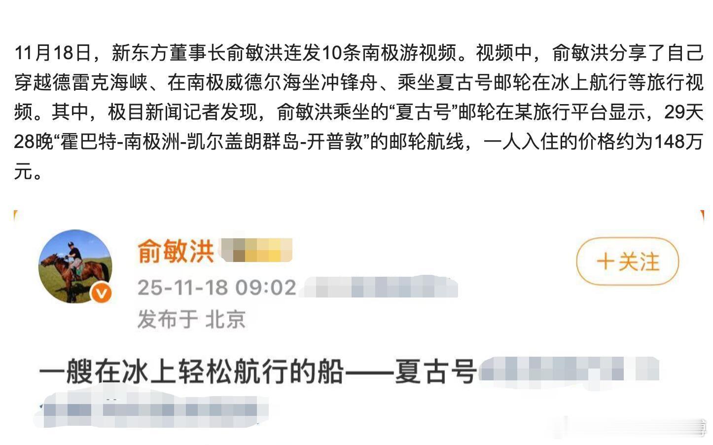 俞敏洪乘坐的夏古号邮轮,又被曝入住最高价约148万元。不敢想后面媒体还会挖出什么料。因为在南极给新东方全体员工写信,引发全网吐槽。俞敏洪确实考虑不周,吃肉还吧唧嘴,多少有些不妥。不过也有一些不一样的观点,认为俞敏洪打拼了大半辈子,现在也到了这个年纪,趁着身体还好看看世界,无可厚非。关键是,现在除了网友,越来越多媒体开始下场报道,结果俞敏洪还在发南极游视频,心是真大啊。