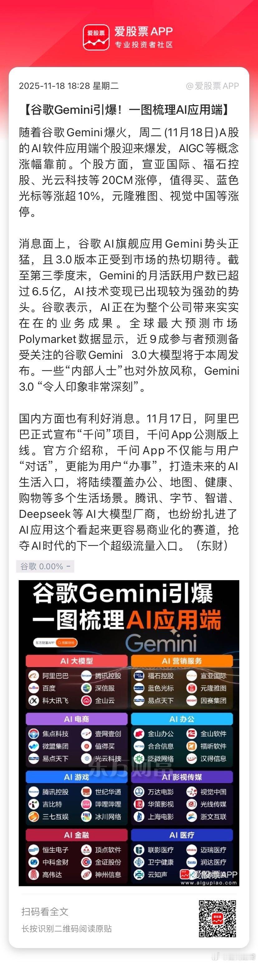 【谷歌Gemini引爆!一图梳理AI应用端】随着谷歌Gemini爆火,周二(11月18日)A股的AI软件应用端个股迎来爆发,AIGC等概念涨幅靠前。个股方面,宣亚国际、福石控股、光云科技等20CM涨停,值得买、蓝色光标等涨超10%,元隆雅图、视觉中国等涨停。 消息面上,谷歌AI旗舰应用Gemini势头正猛,且3.0版本正受到市场的热切期...