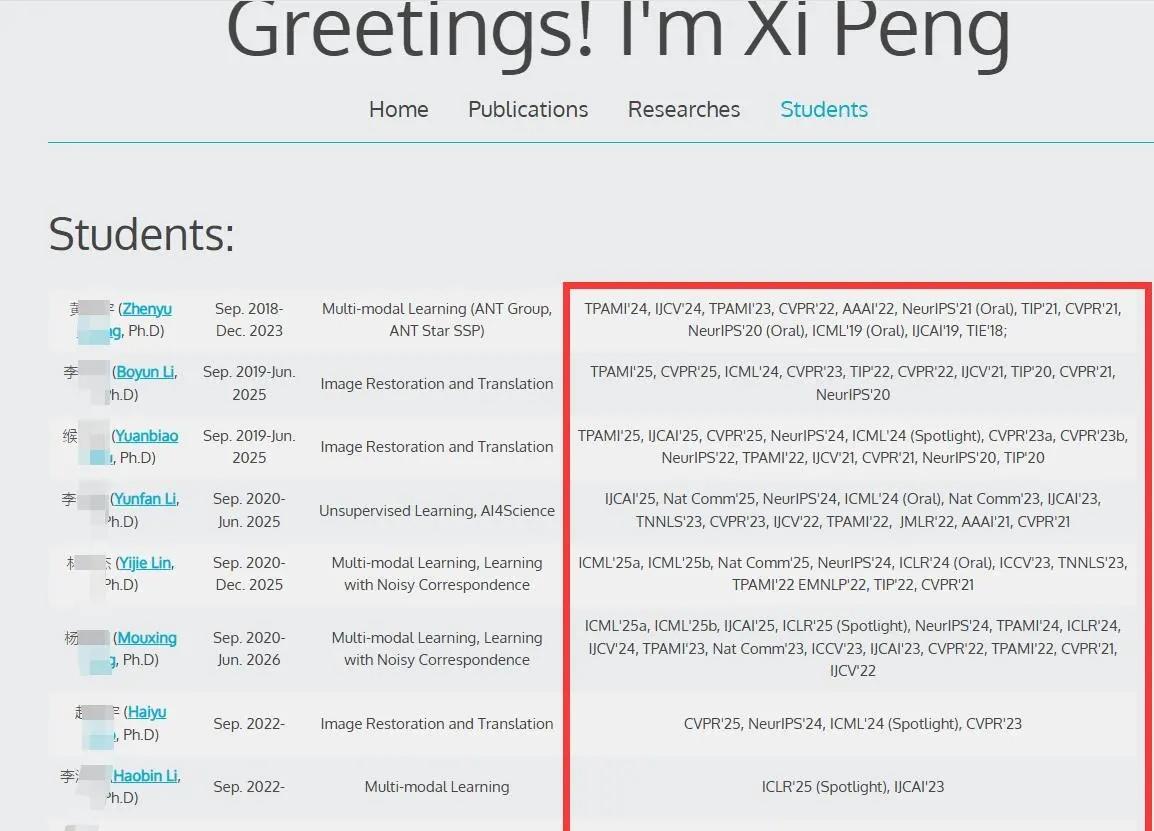 学生成果一流!川大px教授及其学生情况 彭老师,教授,博士生导师,“CJ学者”特聘教授。2014年至2017年,就职于新加坡科技局资讯通信研究院(A*STAR)担任Research Scientist。2017年被四川大学引进任特聘研究员;2018年入选四川省特聘教授;2019年入选"国家特聘青年教授",同年9月破格转聘为教授;2023年入选教育部“CJ学者”特聘教授。主要研究的方向包括机器学习基础理论及其在多学科交叉领域中的应用。他共计在中国计算机学会A类推荐期刊/会议(Nature子刊,ICML,NeurIPS,CVPR,ICCV,JMLR,TPAMI,IJCV等)上发表学术论文百余篇。发表论文中包含多篇ESI热点论文(前1‰)和高被引论文(前1%);作为第一完成人获国家一级学会中国图像图形学学会自然科学一等奖、四川省自然科学二等奖、教育部霍英东青年教师奖(二等,全国15人),ICME最佳论文奖等多个奖励;指导学生获全国互联网+等奖励。 彭玺是IEEE Trans on SMC: Systems (IF:13.451)等四个国际SCI期刊副主编;是IEEE Trans Neural Netw Learn Syst等五个国际SCI期刊特邀编委(GE);是VALSE等多个国内外学术会议程序委员会主席;NeurIPS、ICML、ICLR、CVPR、ICCV、ECCV、AAAI、IJCAI、ACL、EMNLP等国际重要会议的领域主席、专题报告组织主席及分会主席等;是Nature子刊、JMLR、TPAMI、IJCV等国际权威期刊审稿人。 四川大学 川大 科研保姆 保姆哥 保研 读研 读博