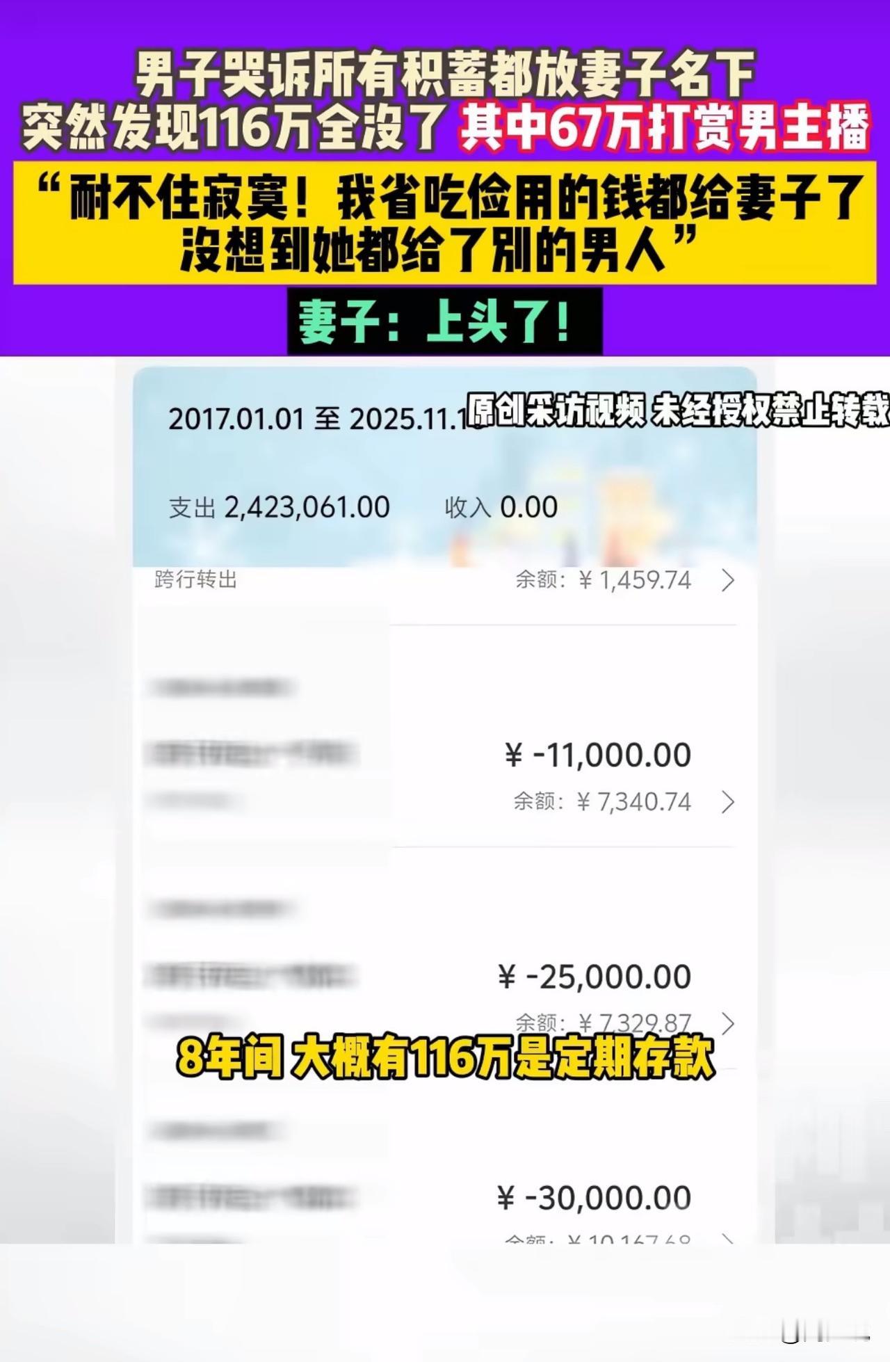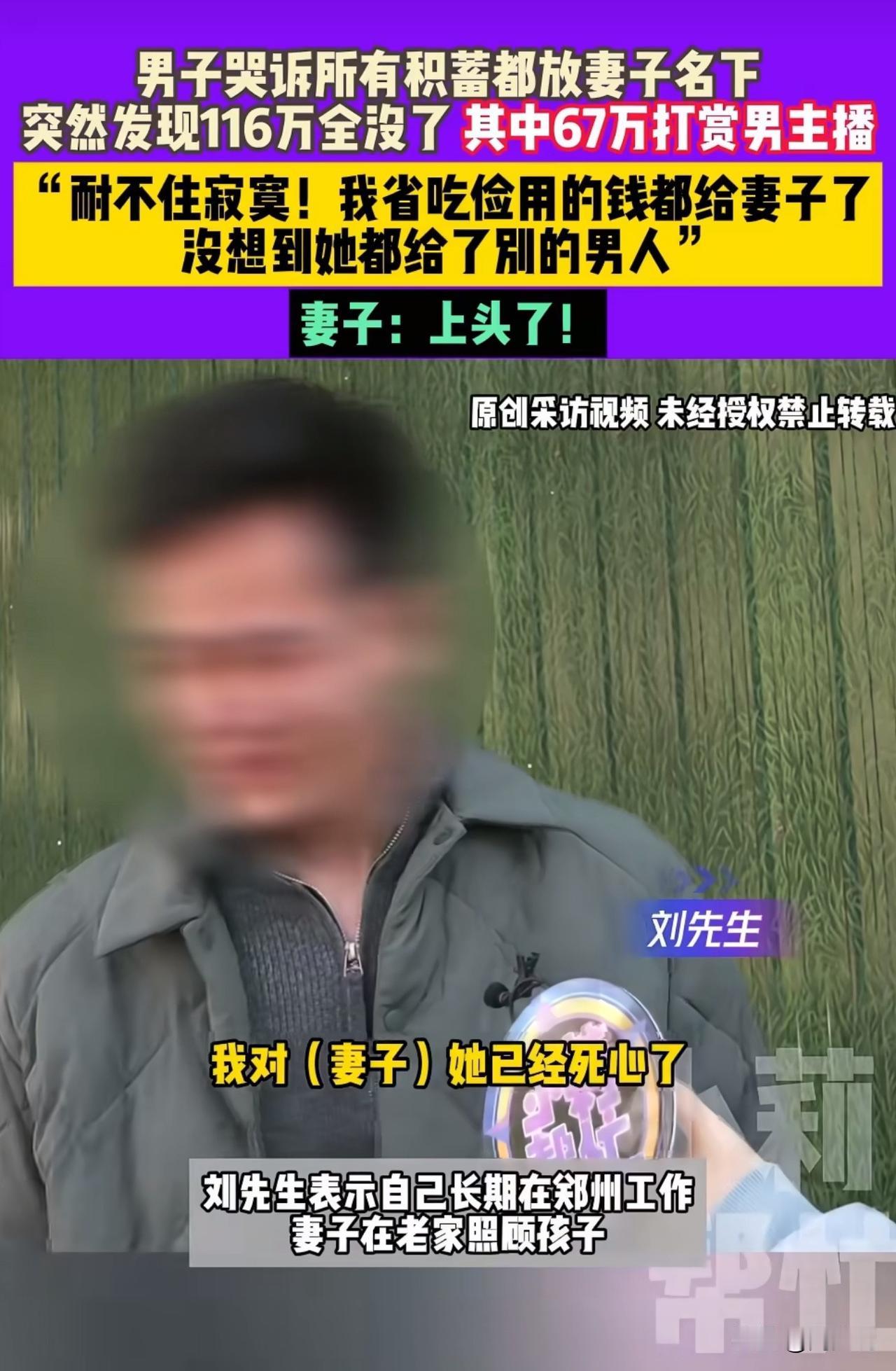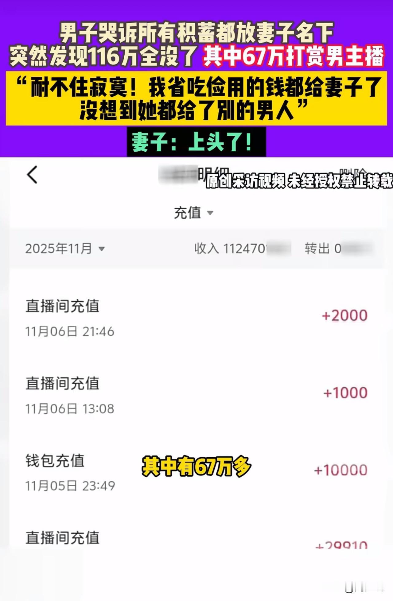 #MCN双量进阶计划#丈夫省吃俭用存116万,全职宝妈竟打赏男主播67万!丈夫痛哭:“我没想到我这么相信她,她却背刺我,耐不住寂寞!”网友怒了! 河南郑州,一位男子的遭遇让人揪心!结婚8年,他在外拼命工作,住300元一月的出租屋省吃俭用,把所有收入交给全职带娃的妻子,攒下116万定期存款。可近日他发现,存款分文不剩,还多了8万多网贷负债,其中67万竟被妻子打赏给了男主播! 面对质问,妻子坦言“当时上头了,就是帮主播打PK”,却说不清剩余钱款去向。刘先生崩溃痛哭:“我那么相信她,她却背刺我”,如今只盼要回部分夫妻共同财产,然后离婚。 此事曝光后,网友炸开了锅。有网友说:“丈夫在外面遭罪,她在家挥霍打赏,太寒心了!” 也有网友在指责:“夫妻共同财产岂能随意造,这行为太不负责任”; 还有网友惋惜:“8年感情毁于盲目打赏,带娃也不能丢了理智”。 看完这事,周少也替这位男子感到气愤,辛辛苦苦赚钱,到头来一场空。婚姻的根基是信任与担当,宝妈带娃不易,但绝非挥霍共同财产的理由。 116万是男子用省吃俭用攒下的血汗钱,更是家庭的底气,盲目打赏不仅伤了爱人的心,还毁了家庭未来。希望这场闹剧能警醒更多人:网络娱乐需有度,守住底线、珍惜眼前人,才是对婚姻最基本的尊重。#寻美三湘# #长沙新朋友#