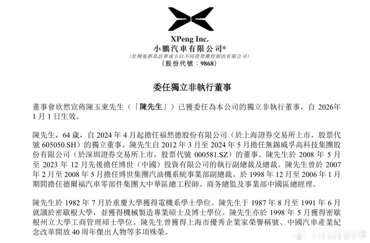 简单几句话快速帮大家了解这事;陈玉东是谁?博世中国前总裁,产业链顶级人物,深度懂工程、供应链和质量体系。独董做什么?参与董事会重大决策,用独立视角监督公司治理,提供专业能力与资源支持。对小鹏的意义?提升工程能力、优化供应链、提升治理成熟度,帮助小鹏从「技术型」公司走向「成熟」主机厂!