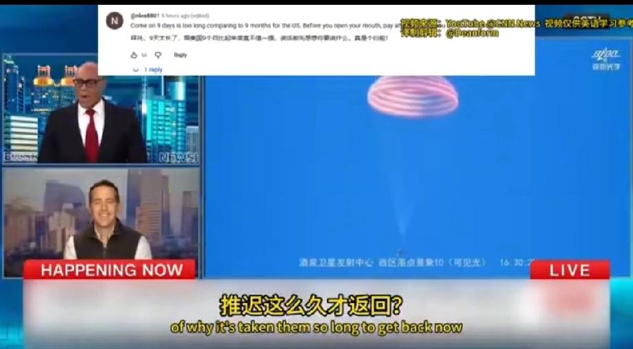 CNN主持人一句话引评论区疯狂阴阳NASA! 你说为啥是9天太久了。 CNN报道神舟二十号航天员返回地球,说是因为太空碎片击中神舟二十号宇宙飞船的舷窗,导致不得不推迟9天才返回。 他说,飞船不是想回来就回来的,座位其实是针对每个航天员进行了专门设置,所以乘坐神舟21飞船回来,就需要重新调整位置,达到最佳,所以才要几天。 看来美国已经忘了他们之前有两个宇航员滞留太空超过大半年。也有可能这个老外可能知道天上一天地上一年。可能因为时间流速不一样,所以我们9天比美国9个月要长。