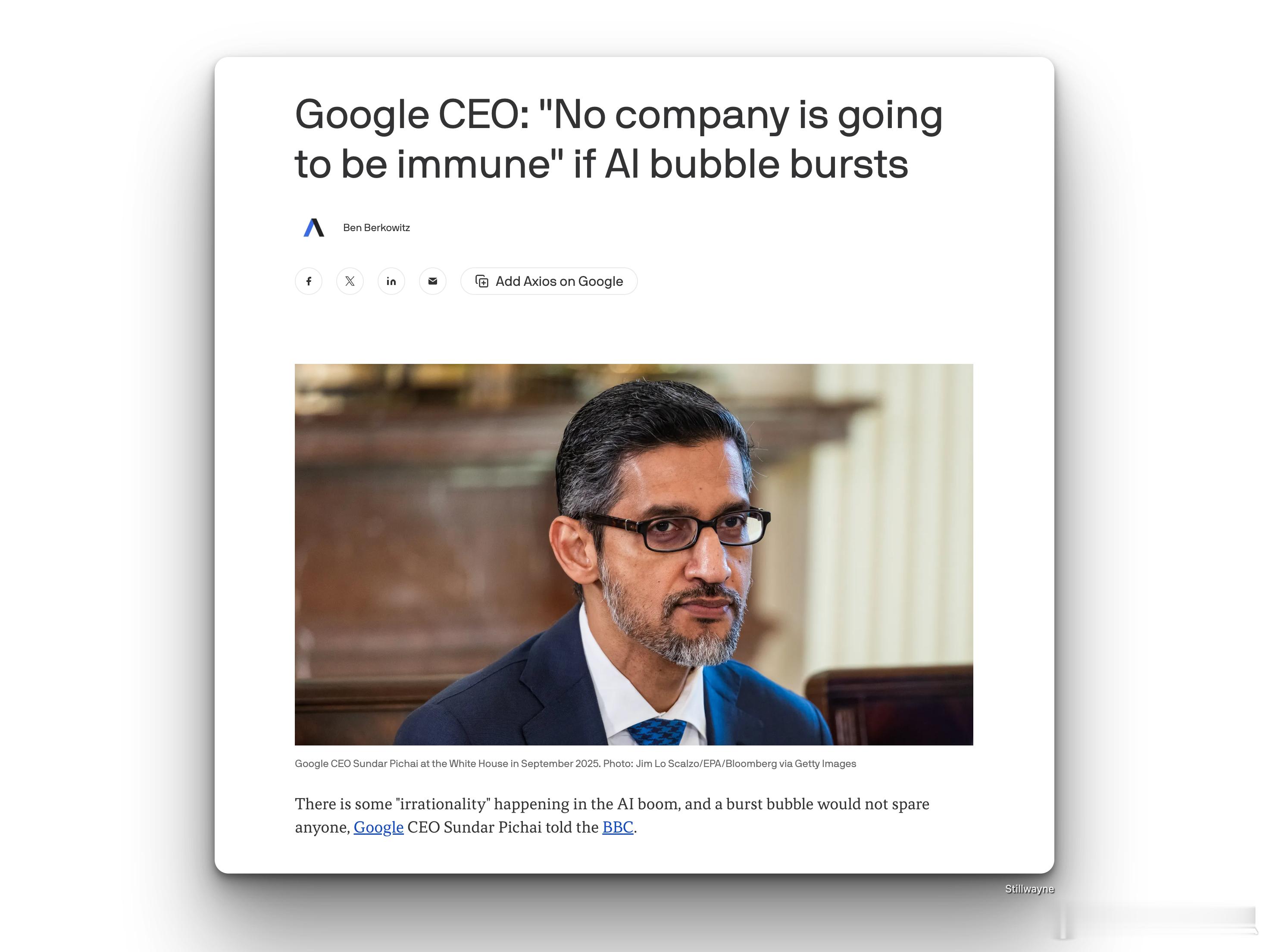谷歌CEO:“如果人工智能泡沫破裂,没有哪家公司能够幸免。”劈柴在接受BBC采访时说:“我们现在可以回顾一下互联网的发展历程。显然,当时存在大量的过度投资,但我们都不会质疑互联网的意义深远 ... 我预计人工智能的发展也会如此。”“所以我认为,在这样的时刻,既有理性的成分,也有非理性的成分。”