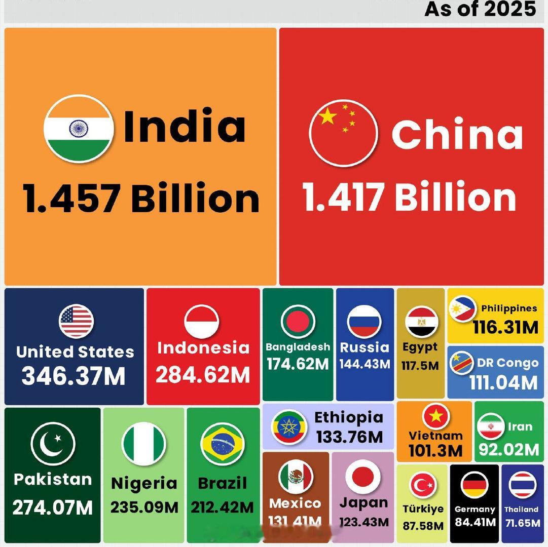 【人口大国的足球水平】根据世界银行的数据,联合国193个成员国当中,人口超过1亿的国家一共有16个。而人口数量排名前十的国家(见图),只有2个晋级,其中美国是以东道主身份直接晋级,所以TOP10当中只有巴西是通过自身实力(预选赛)拿到2026世界杯的入场券。后话:TOP10以外,其余6个人口超过1亿的国家,墨西哥也是东道主,日本和埃及都晋级2026世界杯,民主刚果则参加洲际附加赛。