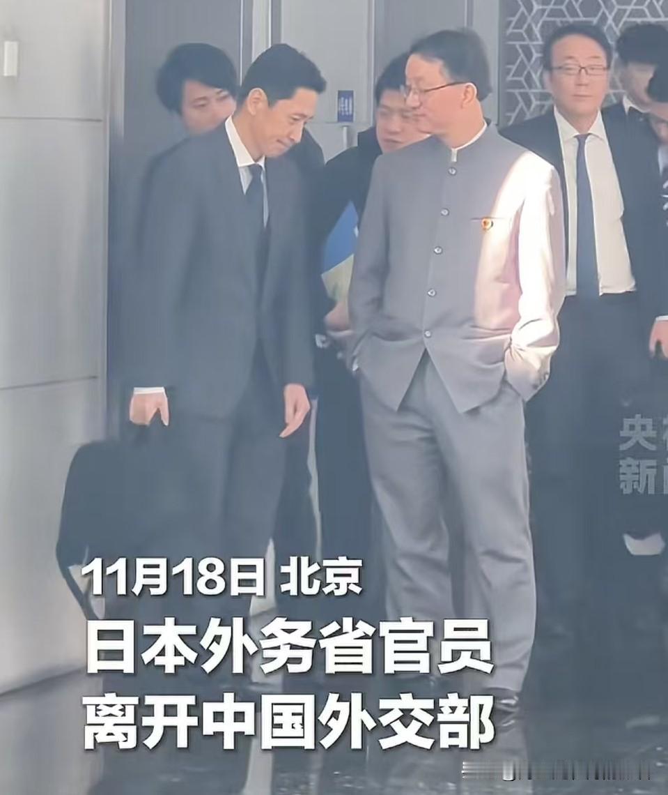 11 月 18 日,日本外务省官员离开中国外交部。 对此,有网友表示: 中山装穿的不张扬还自带气场,尽显我东方人的内敛和风骨。 刘司长插着兜意思很明显。这么冷得天,我要是把手拿出来,可是会冻手(动手)的! 刘劲松司长,身穿中山装,胸前佩戴国徽,双手插兜,威严感十足,对于不尊重我们的人就应该是这样的态度!!! 大家怎么看?欢迎评论区留言讨论! 日本外交