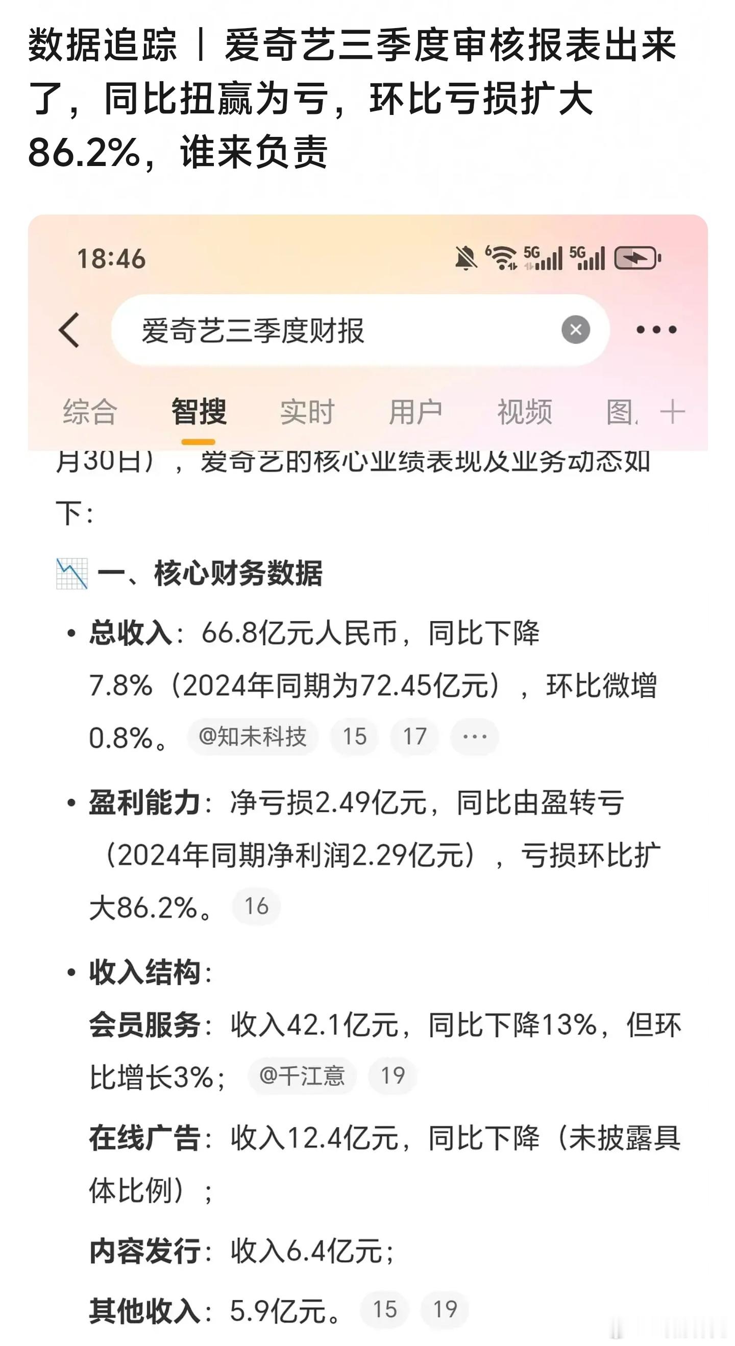 爱奇艺三季度同比扭赢为亏,环比亏损扩大86.2%,谁来负责