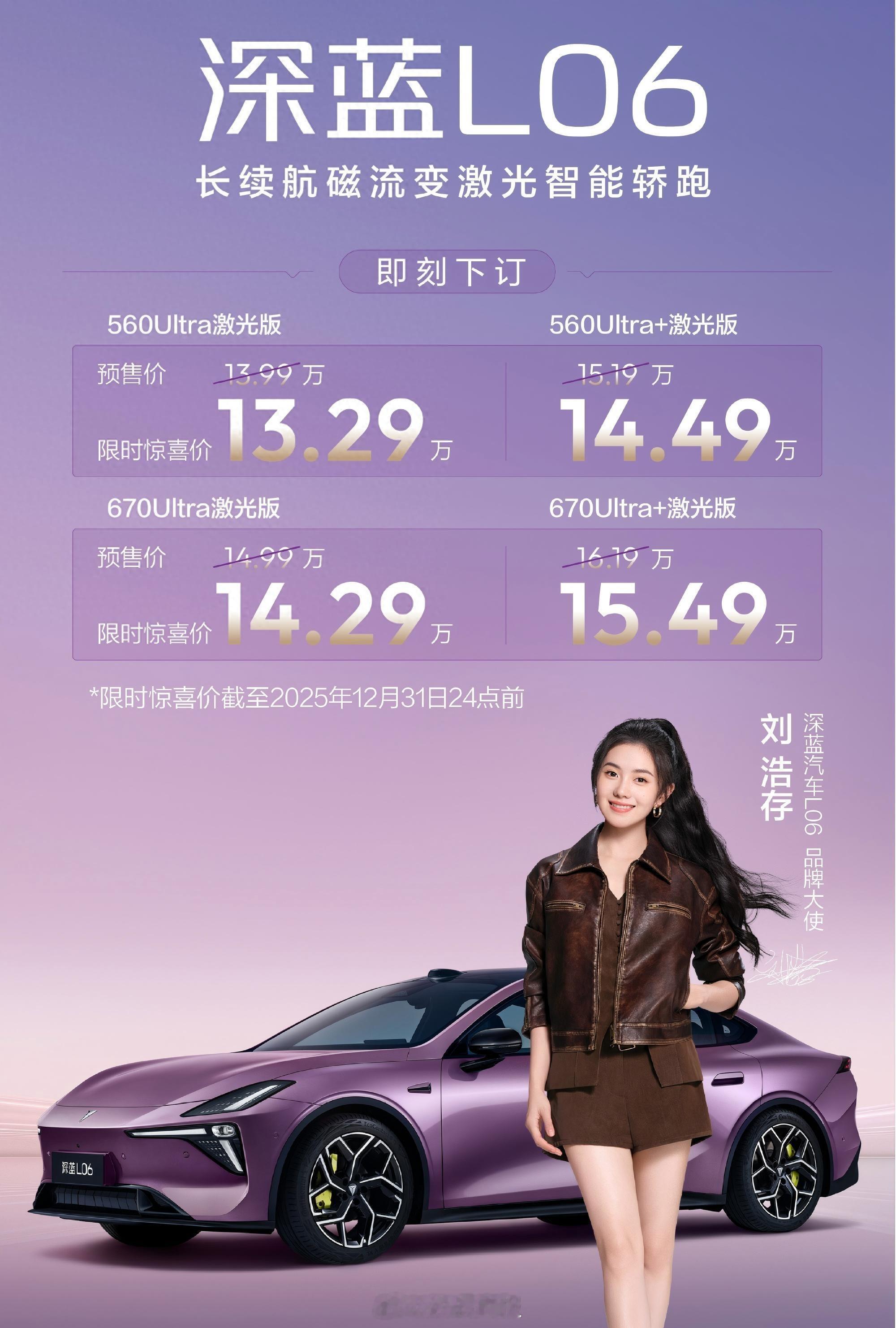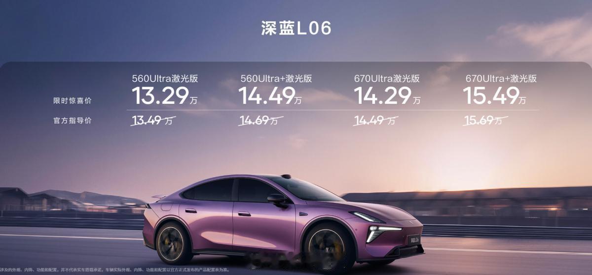 深蓝L06今晚(11月18日)正式上市,本次共推出四款纯电版本,限时售价区间为13.29万至15.49万元。刘浩存为深蓝L06的品牌大使。新车的官方定位是"长续航磁流变激光智能轿跑",从配置来看,这款车在15万级纯电轿车市场带来了不少创新亮点,特别是在驾控系统和智能配置方面表现突出。刘浩存现场揭晓深蓝L06 限时惊喜价:560Ultra激光版:13.29万元670Ultra激光版:14.29万元560Ultra+激光版:14.49万元670Ultra+激光版:15.49万元 从外观设计来看,新车采用溜背轿跑造型,配备了无框车门和电动尾翼,整体风格运动感十足。车身尺寸方面,长宽高分别为4830/1905/1480毫米,轴距达到2.9米,这个尺寸在中型轿车中表现不错。值得一提的是,电动尾翼在时速超过90公里时会自动升起,不仅能提升视觉效果,还能提供额外下压力增强行驶稳定性 内饰和智能配置方面,新车配备15.6英寸悬浮屏和AR-HUD抬头显示系统,搭载全球首发的3纳米车规级座舱芯片,保证了系统的流畅运行。在智能驾驶方面,全系标配11个摄像头、12个超声波雷达和3个毫米波雷达,特别是激光雷达成为全系标配,这在同价位车型中确实少见。这套系统支持高速领航辅助和全场景自动泊车功能,能够满足日常出行的多种需求。 驾控系统是这款车最引人注目的亮点。它搭载中国品牌首款量产的磁流变悬架系统,响应速度达到10毫秒级别,每秒可进行1000次阻尼调节。这套系统能根据路面情况实时调整悬架软硬,既保证了舒适性,又提供了出色的操控性能。配合一体式压铸车身和后驱布局,官方公布的麋鹿测试成绩达到85.6km/h,展现出优秀的操控稳定性。 在动力和续航方面,新车提供560km和670km两种CLTC续航版本,搭载宁德时代磷酸铁锂电池。后置单电机的最大功率为200千瓦,百公里加速时间5.9秒。充电性能方面,支持快速充电,30%到80%充电时间约15分钟,充电15分钟可增加335公里续航,这个表现在同级别车型中颇具竞争力。 深蓝L06以13.29万元起的限时售价,将磁流变悬架和激光雷达这些以往高端车型才有的配置带到了主流价位。这款车在驾控体验、智能科技和续航表现等方面都展现出了不错的产品力,对于关注驾控体验和智能科技的消费者来说,这款车在15万级纯电轿车市场提供了一个颇具竞争力的新选择。