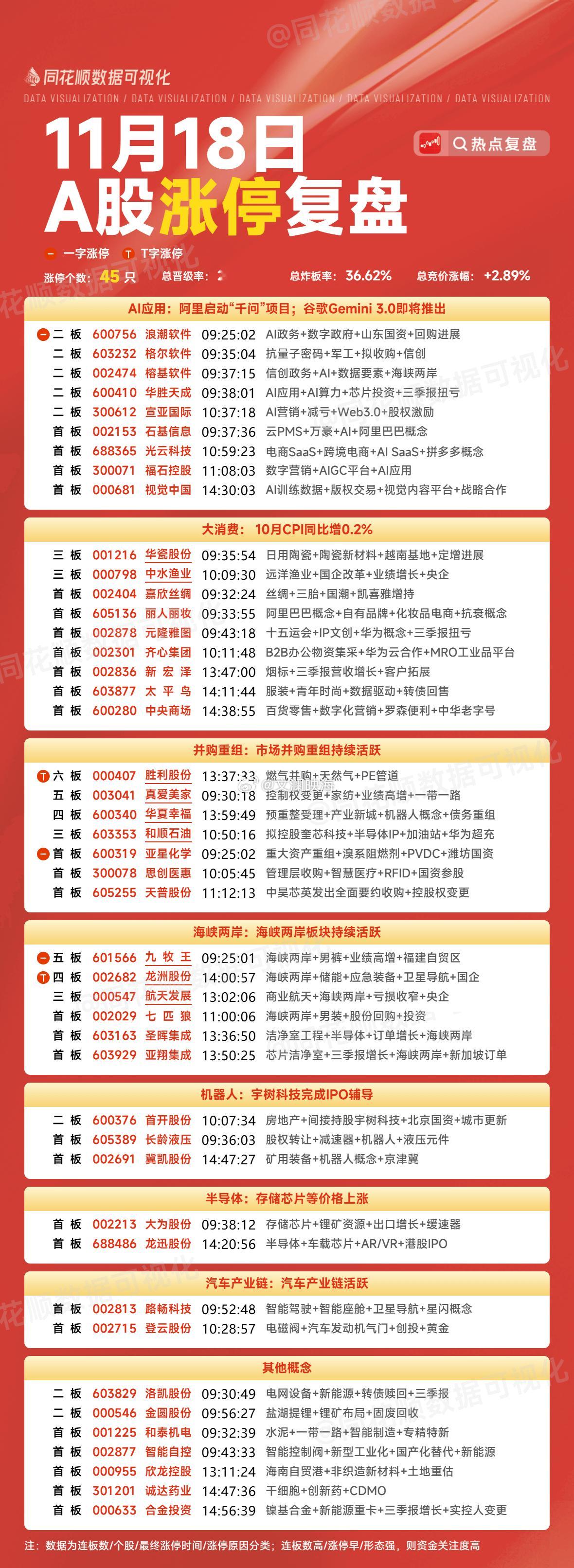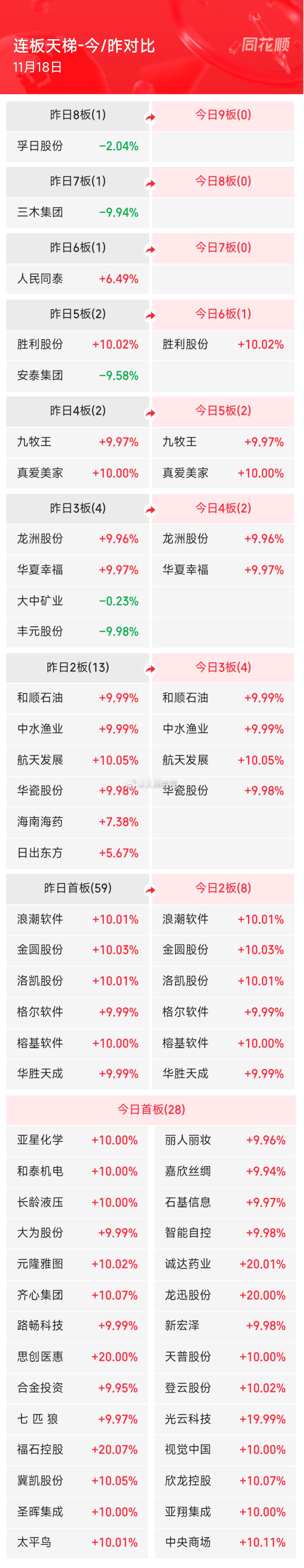 11月18日涨停复盘:连板梯队完整,大消费与AI应用领涨今日全市共45只个股涨停,市场连板结构清晰,大消费、AI应用与并购重组成为今日热点主线。前期强势的锂电池与海峡两岸板块出现回调,而大科技、稀土永磁等题材仍处于底部震荡阶段,整固后具备反弹潜力。【连板梯队】6连板:胜利股份5连板:真爱美家、九牧王4连板:华夏幸福、龙洲股份3连板:航天发展、和顺石油、中水渔业、花瓷股份2连板:榕基软件、格尔软件、浪潮软件、金圆股份、洛凯股份等首板:视觉中国、丽人丽妆、七匹狼、天普股份、中央商城、元隆雅图、亚翔集成等