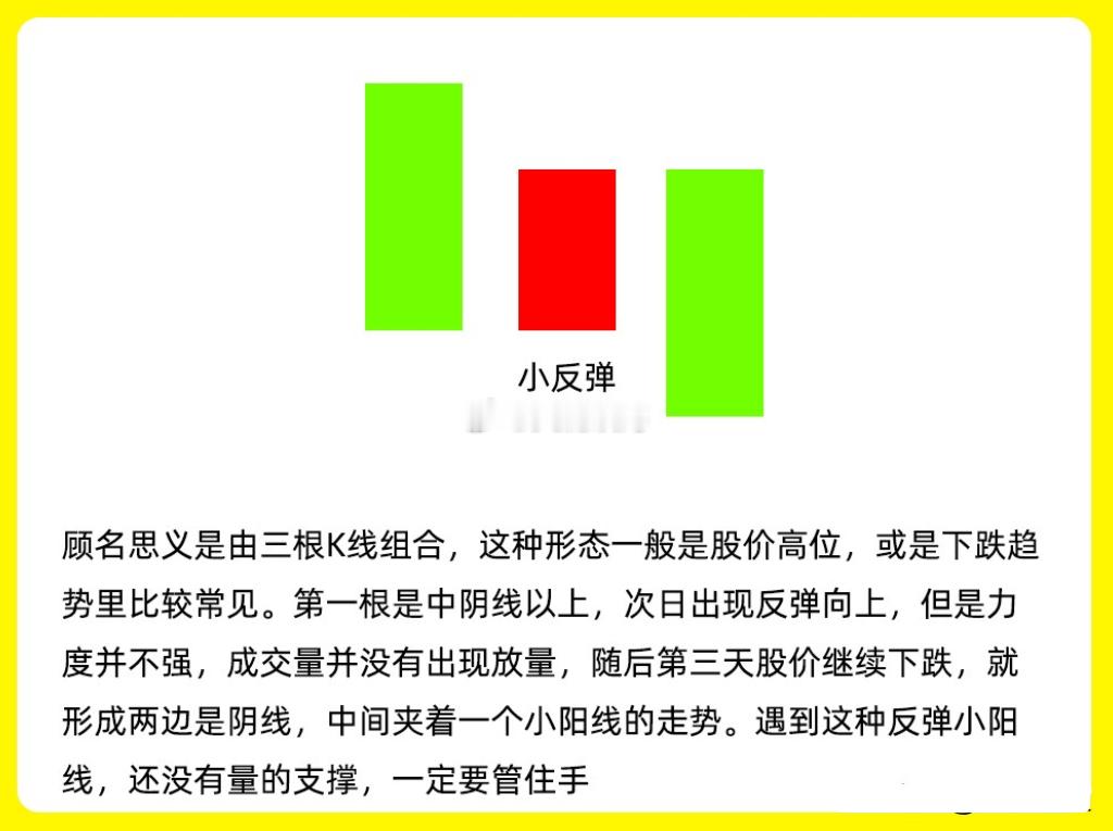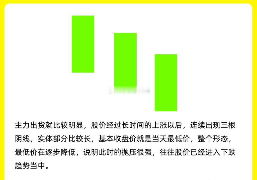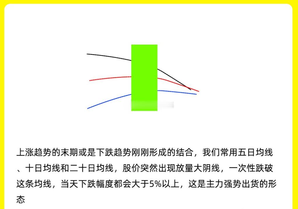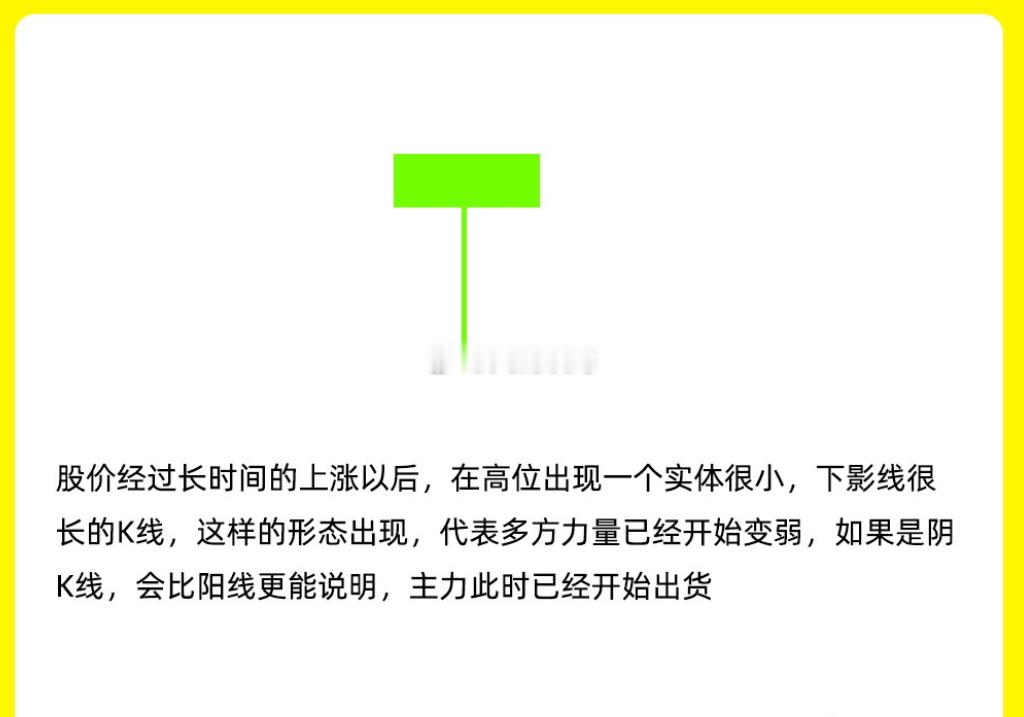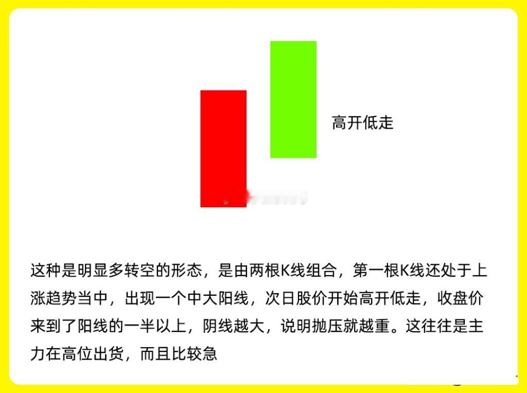 交易的本质是“低买高卖”,然而大多数散户往往操作相反。老股民常说:“会买的是徒弟,会卖的才是师傅。”当股价处于高位,主力资金开始出货时,常伴随成交量异常与多方力量衰竭。以下为六种典型的高位卖出形态,值得每一位投资者重视:一、吊颈线股价经历长期上涨后,在高位出现实体极小、下影线较长的K线。此形态反映多方力量减弱,若为阴线则更明确,通常为主力开始出货的信号。二、断头铡刀常见于上涨末期或下跌初期,股价突然收出一根放量大阴线,同时一次性跌破5日、10日、20日均线,单日跌幅常超5%。此为强势出货形态,应及时离场。三、乌云盖顶由两根K线构成:首日为上涨中阳线,次日高开低走,收盘价深入前阳线实体一半以上。阴线实体越长,抛压越重,表明主力正急于出货。四、两阳夹一阴三根K线组合,常见于高位或下跌趋势中。首日为中等以上阴线,次日缩量弱反弹收阳,第三日继续下跌。若反弹无量,应警惕为主力诱多,切忌盲目介入。五、双飞乌鸦首日收中阳线,次日高开低走收阴,第三日再次高开低走,且阴线实体包裹前一日阴线。该形态反映多空分歧加剧,趋势或将反转。六、三只乌鸦股价长期上涨后,连续出现三根实体较长的阴线,收盘价接近当日最低,整体形态呈阶梯式下行。此为强烈出货信号,通常意味着下跌趋势已确立。技术形态需结合量价关系、市场环境综合判断。单一信号存在局限性,建议大家建立系统化的止损止盈纪律。市场有风险,决策需谨慎。