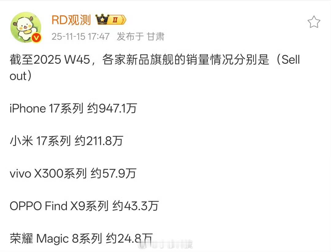 卢伟冰在业绩电话会上透露,小米 17 系列开售5天销量破100万、11 月初销量突破200万,比上代快了很多这个数据应该是出货数据,因为官方从来不会宣传激活数据,主要是行业根本没有正规机构统计激活数据,所谓的激活数据都是不入流的非正规数据源,真假性很难判断而根据两个博主给的激活数据是都比卢总说的出货数据有较大出入,其中A博主截止11.2号,小米17系列激活量202万,B博主截止11.9号,激活量212万,这就意味着出货量基本等于激活量了,考虑到出货到激活的转化问题,出货量肯定要比激活量大不少,所以谁的数据有问题?