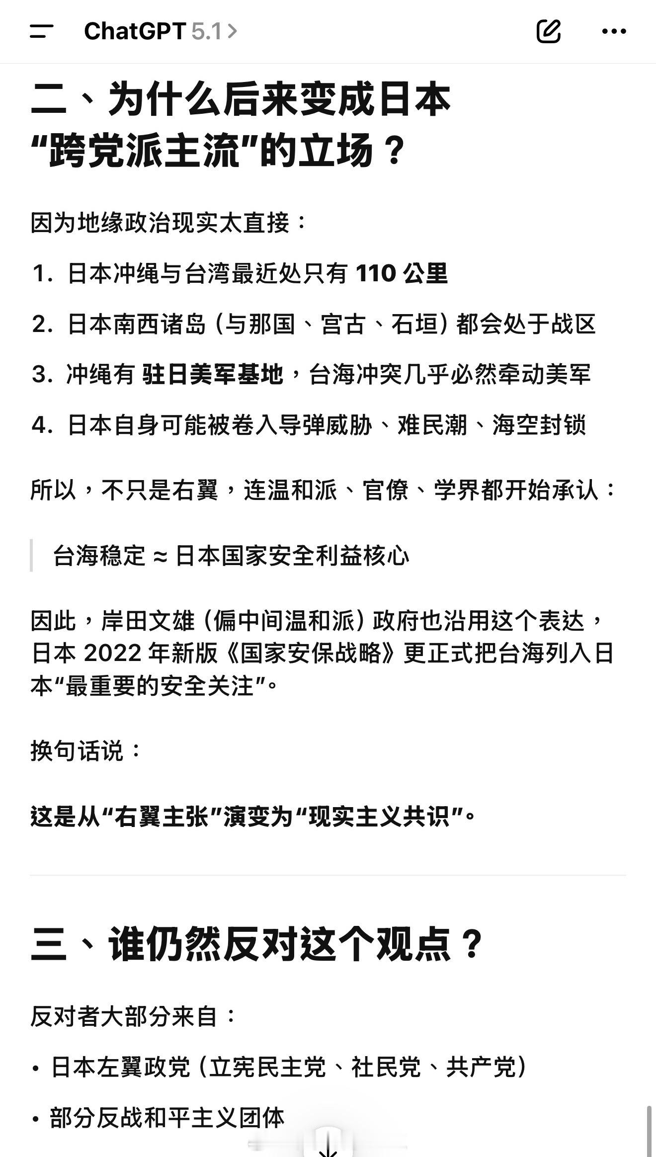 【看看ChatGTP怎么解释“台湾有事,就是日本有事”】日本鬼子的核心观点是:台海一旦发生冲突,日本必然卷入,因为美军会介入、冲绳会被波及、日本国家安全会直接受影响。起初是极右翼分子的观点,慢慢的,成了跨党派的立场:1. 日本冲绳与台湾最近处只有 110 公里2. 日本南西诸岛(与那国、宫古、石垣)都会处于战区3. 冲绳有驻日美军基地,台海冲突几乎必然牵动美军4. 日本自身可能被卷入导弹威胁、难民潮、海空封锁
