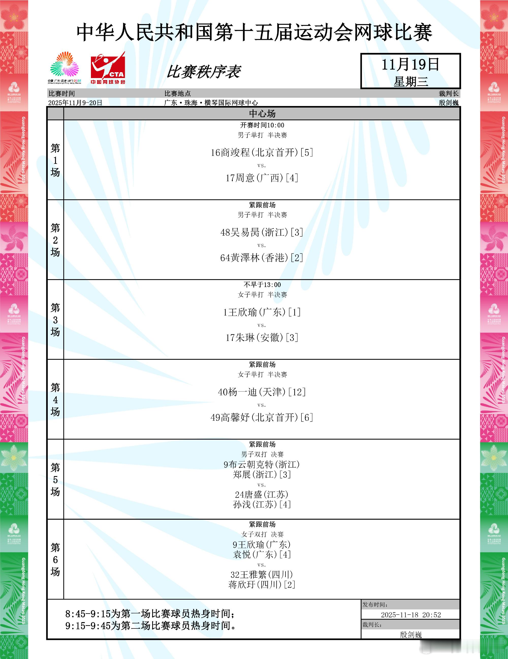 全运会19日(周三)网球赛程▼单打半决赛:10:00,(北京)商骏程vs(广西)周意11:30,(浙江)吴易昺vs(香港)黄泽林13:00,(广东)王欣瑜vs(安徽)朱琳14:30,(北京)高馨妤vs(天津)杨一迪▼16:00,男双决赛:(浙江)步云朝科特/郑展vs唐盛/孙浅(江苏)▼17:30,女双决赛:(广东)王欣瑜/袁悦vs王雅繁/蒋欣玗(四川)◆王欣瑜是唯一在单打和双打都晋级半决赛的选手。有可能双冠加冕。