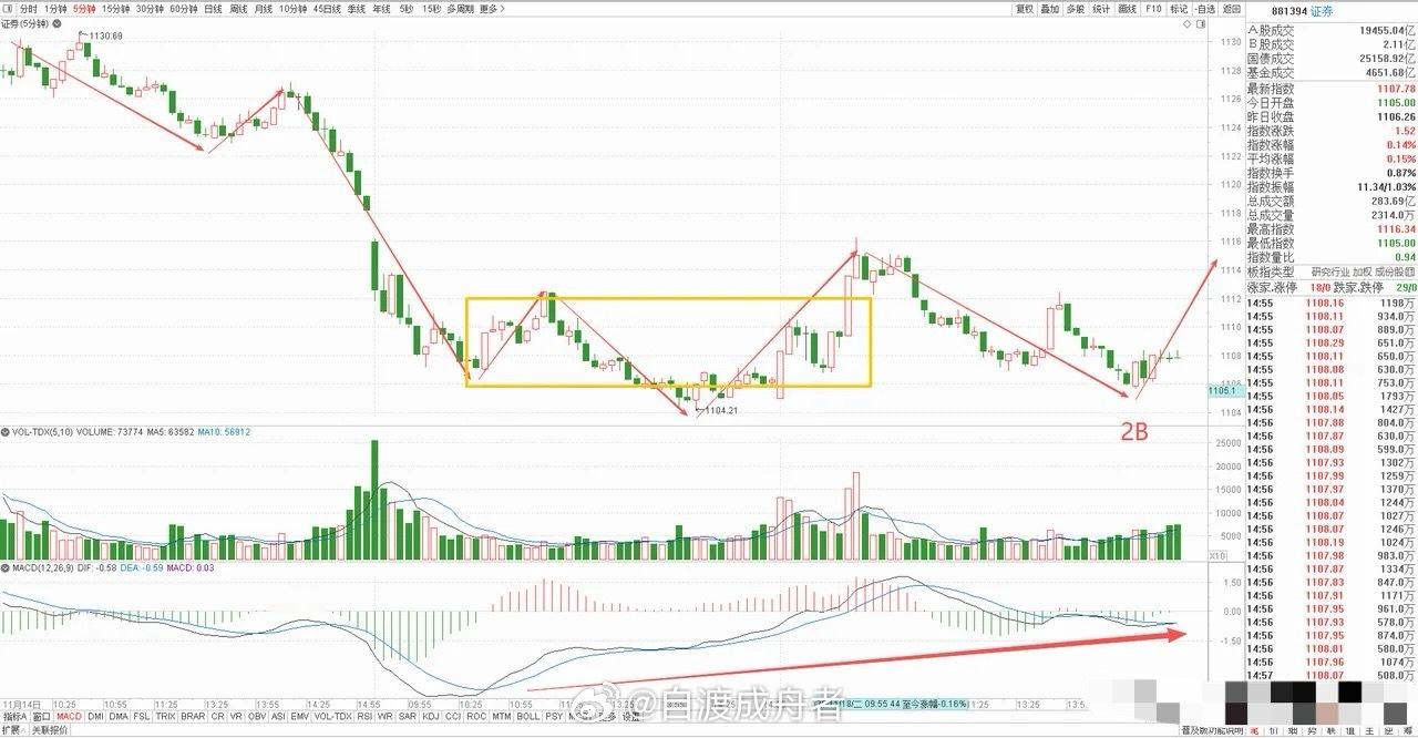 证券板块短线止跌信号初现:明日能否封闭缺口确认反弹?券商板块今日走出冲高回落走势,收出一根放量小阳线,短线止跌信号初步显现。早盘小幅低开后,板块快速拉升近1%,成交量同步放大,直接向前期缺口发起冲击;但受市场整体弱势环境影响,主力并未逆势强攻,选择保留上攻力量,最终未能一鼓作气完成缺口封闭,为明日走势留下悬念。从技术结构来看,今日的尝试性上攻已展现板块企稳意愿,核心看点在于明日能否延续上行态势、完成缺口封闭——若能实现,将正式确认短线止跌,反弹逻辑进一步夯实。结合5分钟图分析,当前板块正处于中枢下跌结构的向下离开段:若明日早盘直接向上拉升,有望构建二买信号,宣告调整结束;即便再度下探出现新低点,也大概率形成强有力的背驰买点,短线仍具博弈机会,可重点跟踪。