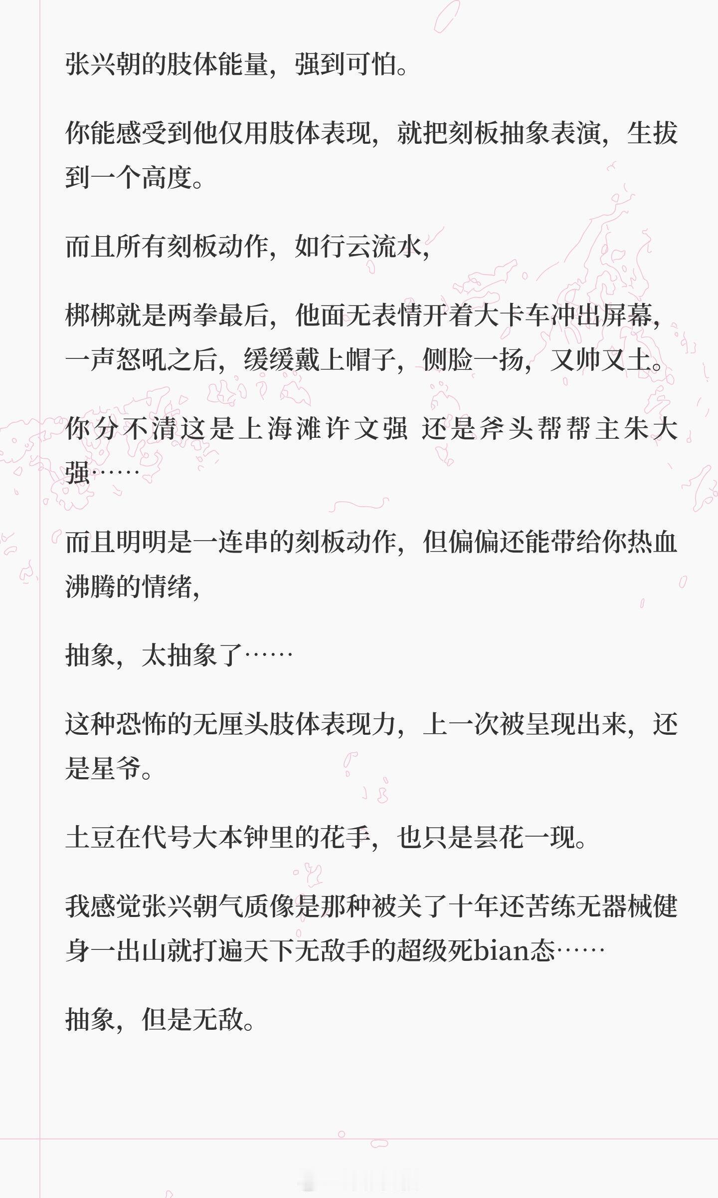 张兴朝的抽象,已经到了无敌之境张兴朝的肢体表演将刻板动作演绎得淋漓尽致,行云流水般流畅,情绪激昂,仿佛将观众带入热血沸腾的氛围。他的无厘头风格与星爷、土豆大本钟的表演相媲美,展现了超凡的肢体表现力和无与伦比的震撼力。