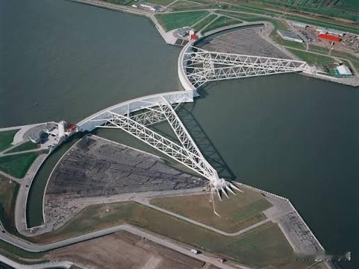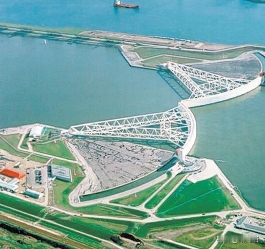 这是位于荷兰鹿特丹西南部的马仕朗防风暴大坝 (Maeslantkering)。它是荷兰“三角洲工程”(Delta Works)的最后一个重要组成部分,也是世界上最大的可移动防洪屏障之一。 大坝由两扇宽 210 米、高 22 米的巨大弧形浮动闸门组成,总长度超过 300 米。正常情况下,闸门停靠在河道两岸,保证欧洲第一大港鹿特丹港的航运畅通。 当北海潮位预计超过 3 米时,一个超级计算机控制的系统会自动启动关闭程序。闸门会注水漂浮,然后移动到河道中央合拢,形成一道坚固的防洪屏障。 该设计旨在抵御千年一遇的风暴潮,保护荷兰南部的百万居民和重要经济区域免受洪水威胁。 尽管大坝于 1997 年建成,但在很长一段时间内只在测试时关闭。首次因实际风暴威胁而完全关闭是在 2007 年,最近一次是在 2023 年。