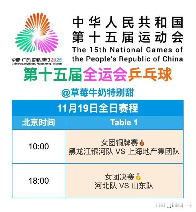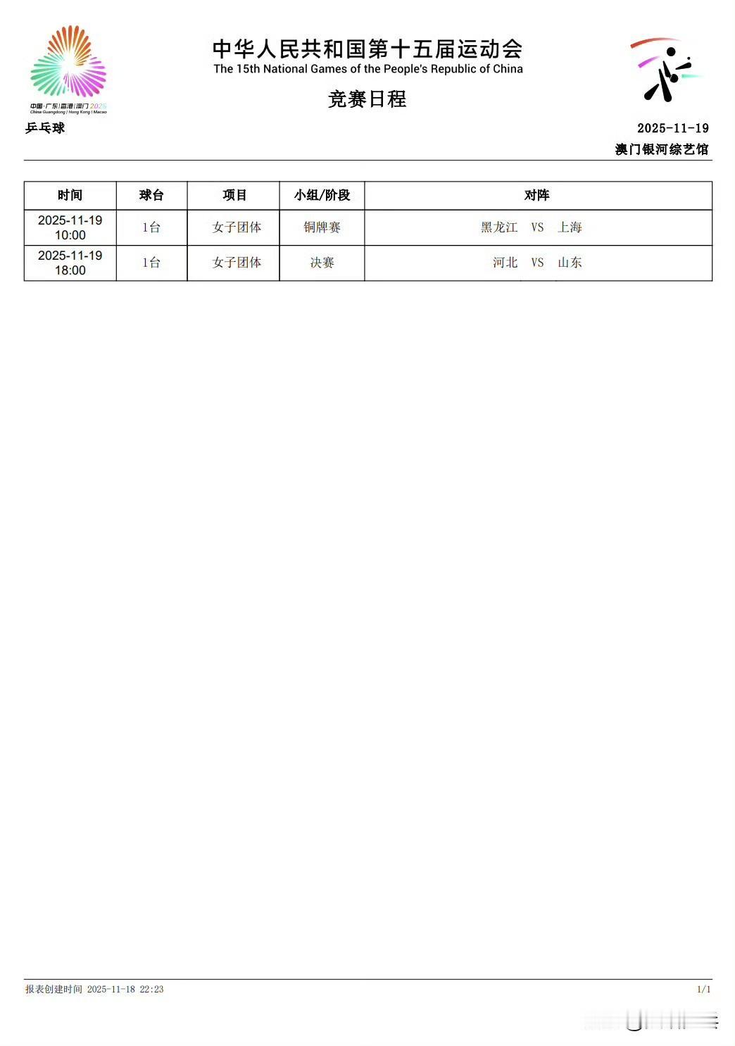 第十五届全国运动会·乒乓球项目 11月19日全日赛程【 P2-3】 10:00女团铜牌赛 黑龙江银河队VS上海地产集团队 18:00女团金牌赛 河北队VS山东队