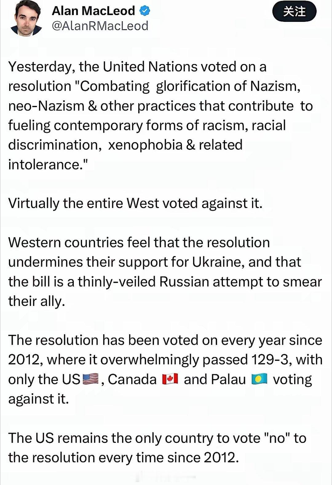 “反对美化纳粹主义”决议案高票通过。令人诧异的是几乎整个西方国家都投了弃权和反对
