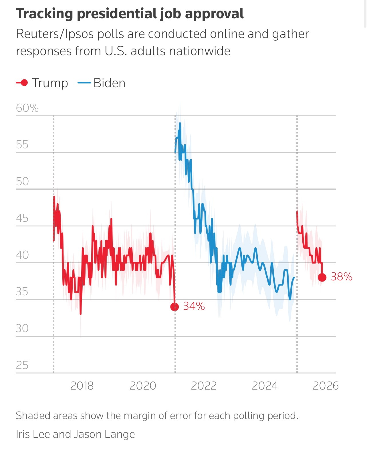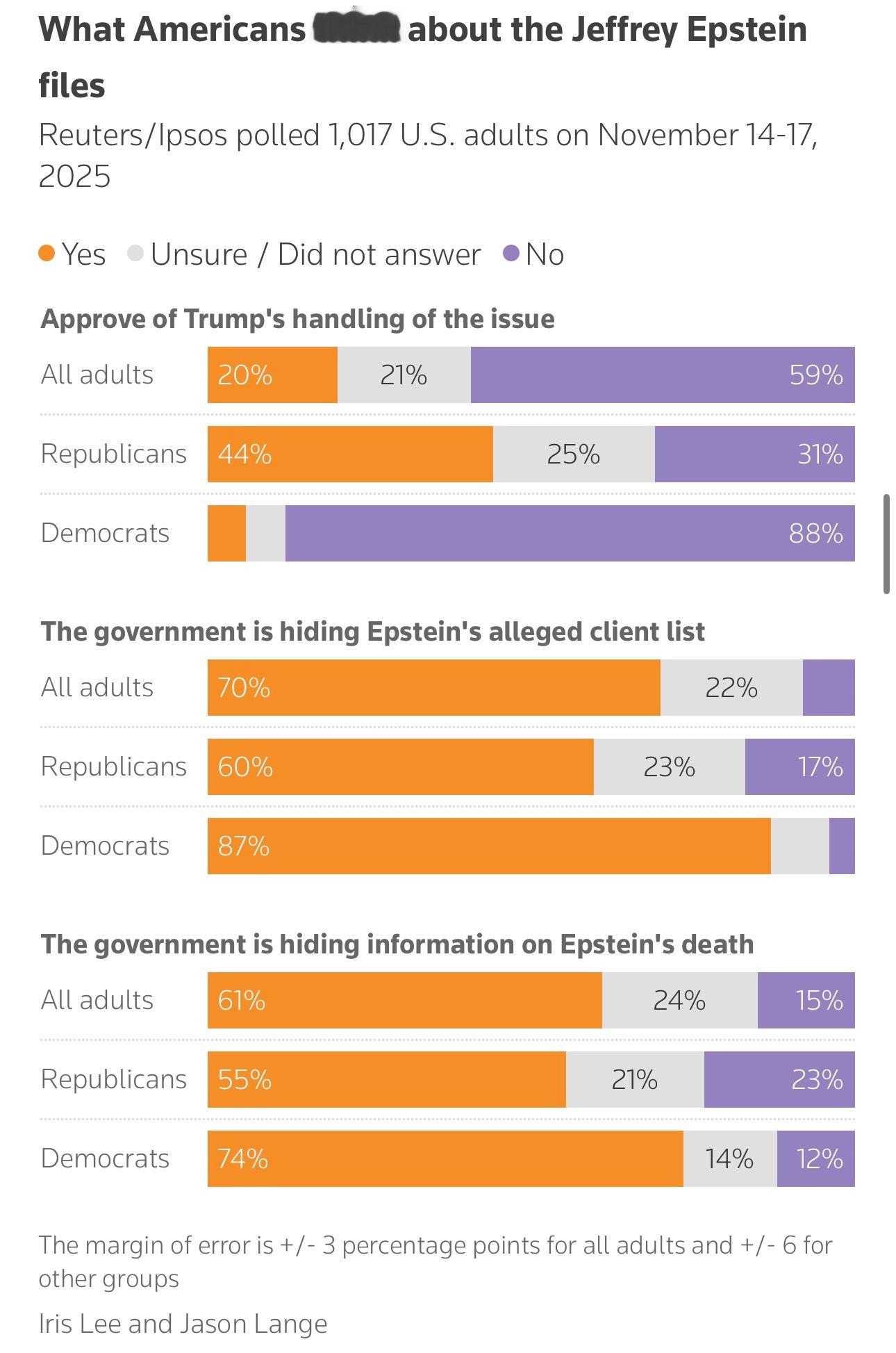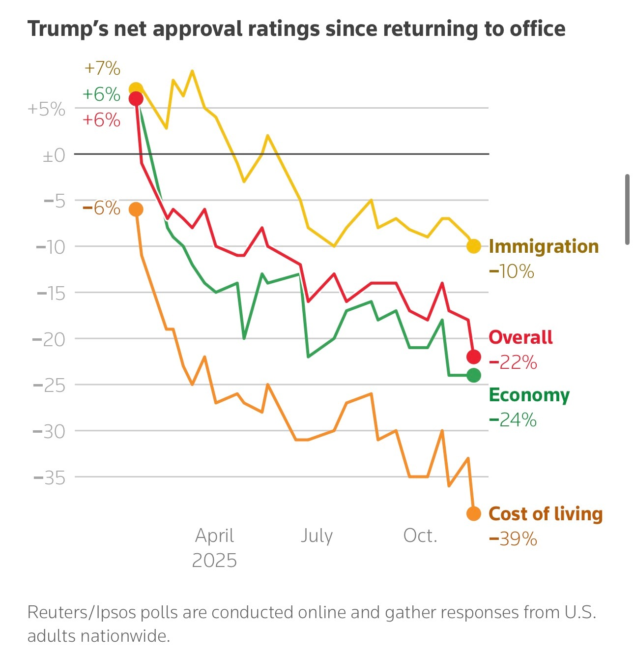 特朗普支持率创新低,压倒多数的美国人认为他处理生活成本和爱泼斯坦问题不当 路透社/益普索的一项民调显示,特朗普的支持率跌至38%,是他第二个总统任期以来的最低点。美国民众对他在生活成本问题上的应对方式,以及他对性犯罪者爱泼斯坦案件相关处理感到不满。为期四天的民调于周一结束,背景是特朗普对共和党的控制力正出现削弱迹象。为海外华人提供有价值的信息与分析,更多内容和全文可在蓝天、电报、x查找causmoney,或直接谷歌搜索由共和党掌控的众议院周二通过了要求司法部公开爱泼斯坦相关档案的法案,数月来特朗普一直反对,但在他昔日国会中的亲密盟友玛乔丽·泰勒·格林的压力下,随着国会议员准备绕过总统推进法案,特朗普在周日改口支持。调查显示,特朗普的整体支持率相比11月初的另一轮路透社/益普索民调下降了两个百分点。特朗普在第二个任期开始时支持率为47%。自1月以来下滑9个百分点,使他目前的整体支持率接近他第一任期内的最低点,也接近拜登的历史低点。拜登的支持率曾低至35%,而特朗普第一任期的支持率一度跌至33%。特朗普在政治生涯中经历了多次危机。本轮调查显示,他在共和党内的支持率仍然坚挺。今年以来,民众普遍认为特朗普在帮助家庭应对日常支出方面做得不够,这种看法曾对拜登政府造成严重打击,并在去年总统选举中帮助特朗普击败哈里斯。只有26%的美国人认为特朗普在控制生活成本方面表现良好,低于本月初的29%。自特朗普1月就任以来,通胀水平依然高企,过去12个月美国消费者物价上涨了3%,尽管就业市场出现疲软。大约65%的受访者——包括三分之一的共和党人,表示不认可特朗普在生活成本问题上的表现。特朗普的核心经济政策是提高进口商品关税,旨在提振美国制造业。但许多经济学家认为,这一政策反而推高了物价。由于对公众的不满,特朗普上周下调了咖啡、牛肉、香蕉等基本商品的进口税。他的低迷人气可能使共和党在明年的国会选举中面临更大风险。尽管如此,调查显示选民仍认为共和党在经济政策上的表现优于民主党。路透社/益普索的调查显示,仅有20%的美国人认可特朗普在爱泼斯坦案件上的处理方式,在共和党内部也只有44%的认可率。大约70%的受访者——其中包括87%的民主党人和60%的共和党人,认为政府在隐瞒爱泼斯坦客户的信息。此次路透社/益普索民调通过网络进行,覆盖全美1017名成年人,误差幅度约为3个百分点。