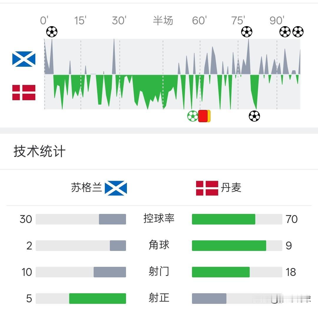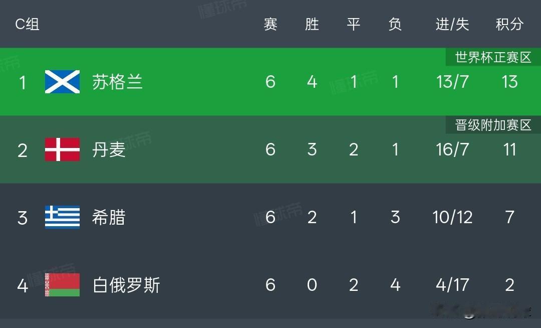 苏格兰4-2晋级世界杯,丹麦队输掉比赛只能去打附加赛。 苏格兰必须取胜才能直接晋级,比赛中苏格兰先进一球,之后就开始去被动,丹麦队点球扳平后吃到红牌,苏格兰再度领先后又被扳平,补时阶段苏格兰连进两球锁定胜局。 苏格兰以小组第一的身份晋级世界杯,世界排名第20的丹麦队去打附加赛。