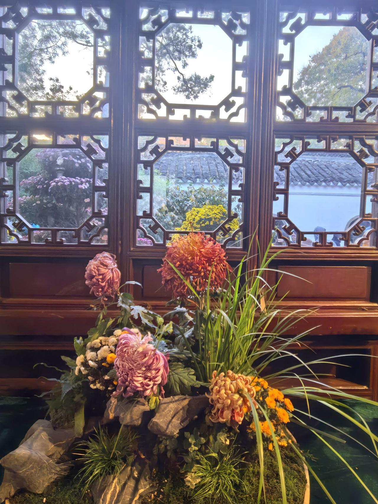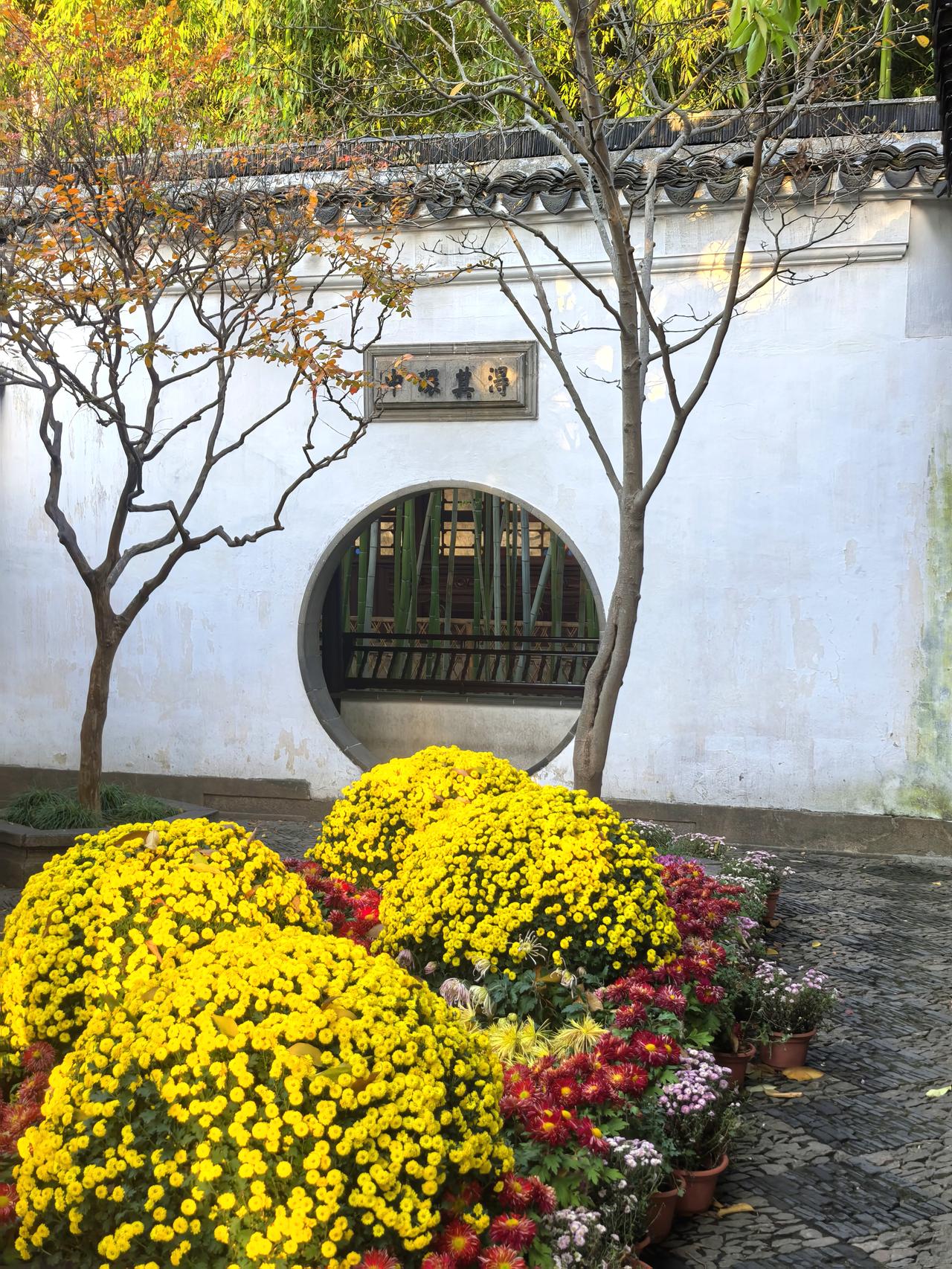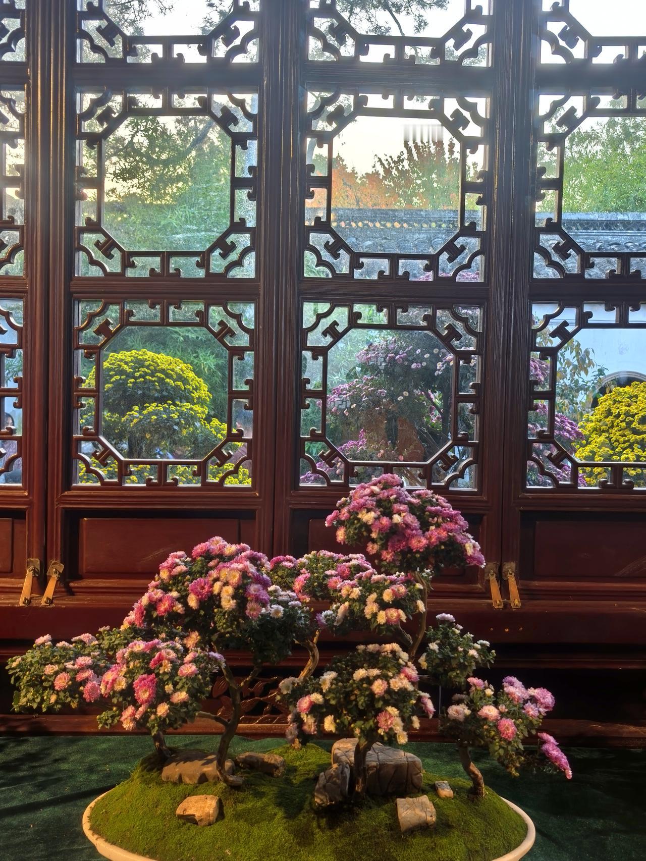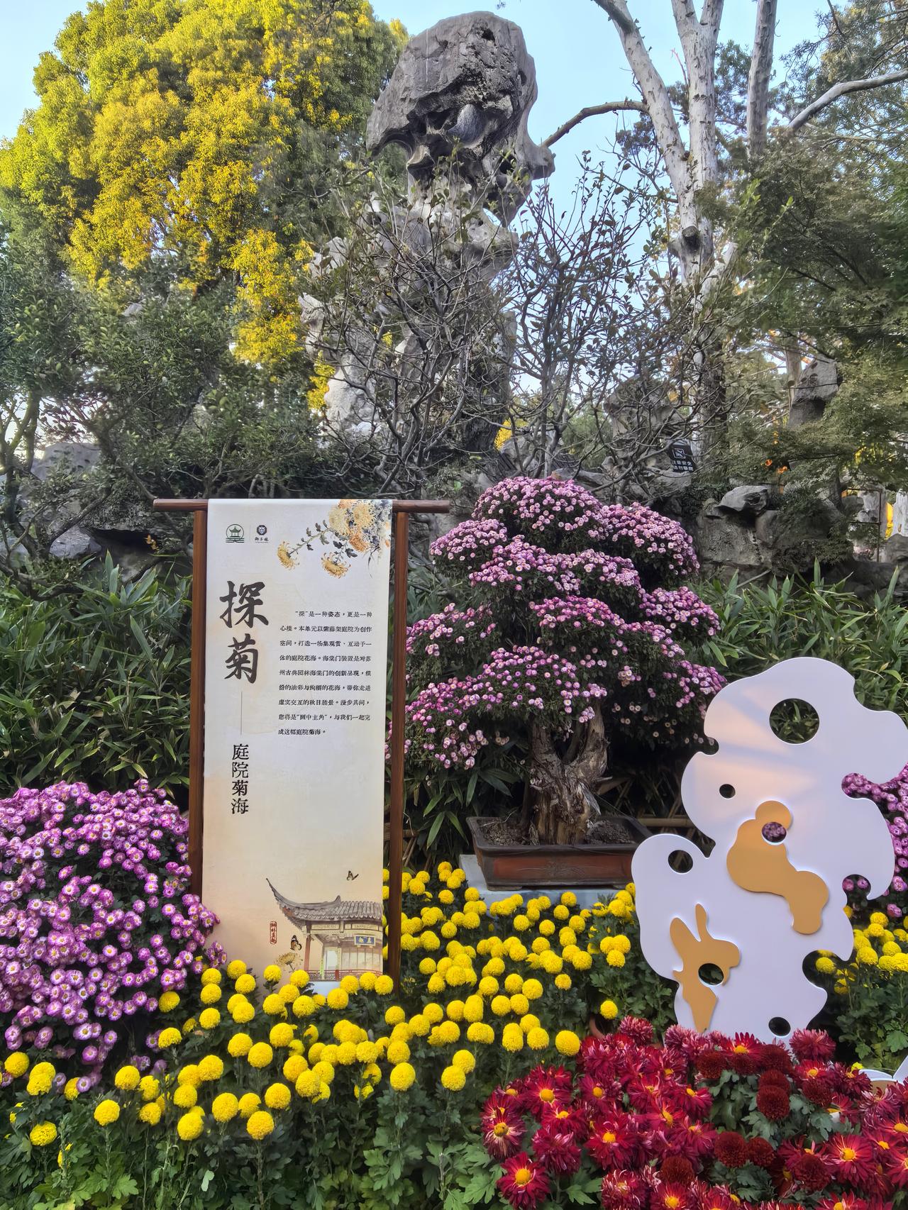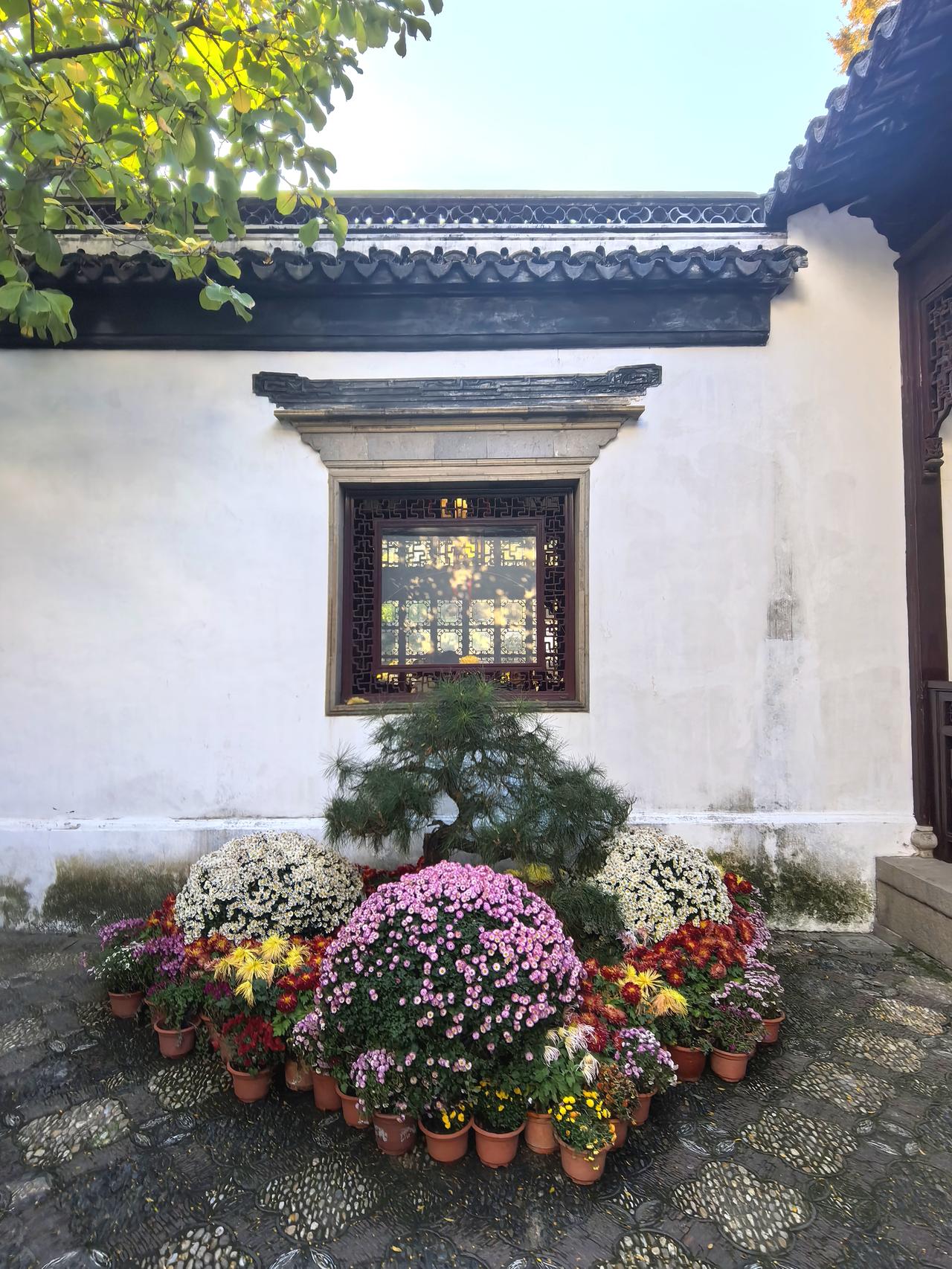 寒后狮林,菊韵藏秋。 昨日寒潮过境苏州,朔风卷着寒意漫过古城街巷,让这座江南城猝不及防跌入入冬以来的最冷时光。今日风歇云开,冷意未消却天光澄澈,恰是赴狮子林赏菊的好时节——寒风吹散了尘嚣,反倒让园中的秋菊更显清艳。 踏入狮子林,最先撞入眼帘的便是廊庑间、石峰旁处处点缀的菊影。朱红廊柱下,墨紫的“墨荷”抱蕊凝香,花瓣厚重如绒,在清冷天光下泛着暗哑的光泽;白菊“玉玲珑”则素净得不像话,层层叠叠的花瓣轻舒,宛若初雪覆在翠绿花茎上,风一吹便簌簌晃动,落得满身清寒。最妙的是假山石缝间探出的几丛黄菊,明黄的花色撞着深灰的湖石,恰似冬日里不肯褪色的秋意,硬生生在冷寂中酿出几分热烈。 沿着曲廊缓行,脚下的青石板还留着寒潮过后的微凉,指尖触到廊下的木栏,凉意便顺着指尖漫上来,却更衬得身旁菊花的香气清冽。阳光透过斜斜的枝桠,在花瓣上投下细碎的光斑,那些盛放的、半开的、含苞的菊花,都在光影里透着别样的灵动——有的昂首向阳,似在与寒日较劲;有的低眉敛目,藏着江南独有的温婉。偶有游人轻语,脚步声与风声交织,倒让这座以叠石闻名的园林,多了几分烟火气与诗意。 登假山远眺,满园菊色与亭台水榭相映成趣。远处的池水泛着粼粼波光,岸边的垂柳已染浅黄,与各色菊花错落排布,像极了一幅晕染得当的水墨丹青。寒风掠过,卷着菊花的暗香扑面而来,深吸一口,竟连冷意都淡了几分,只剩满心的清爽。原来寒潮过后的赏菊,少了秋日的燥热,多了冬日的沉静,反倒更能品出菊花“宁可枝头抱香死”的风骨。 离开时,暮色已渐浓,园中的菊花在余晖里愈发显露出清绝的姿态。寒潮虽寒,却让这秋末的菊韵更显珍贵——在苏州最冷的日子里,狮子林的菊花正以最热烈的模样,留住最后的秋光,也让每一位驻足的游人,在冷风中拾起了一抹温暖的诗意。原创作品 金秋狮子林赏菊 随手记录秋日生活 随手拍菊花 苏州园林 走进狮子林