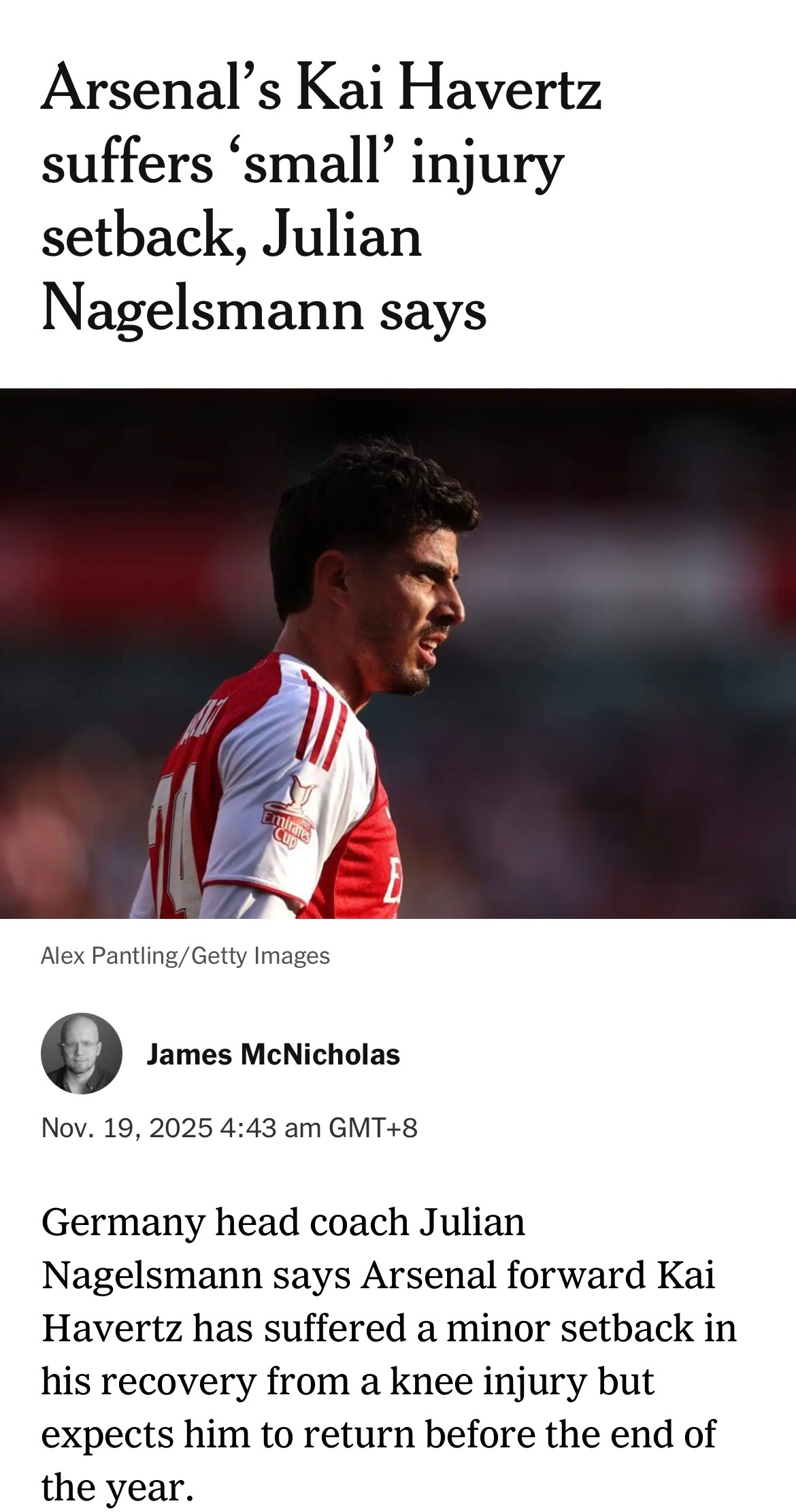 The Athletic:加布里埃尔因伤缺阵一到两个月(与此前分析遭遇的可能为2级撕裂的判断一致,4到6周的时间);而根据德国队主帅纳格尔斯曼的回应,哈弗茨在膝伤恢复过程中遇到了一些反复的小麻烦,预计也要到今年年底才能复出。对阿森纳来说,本赛季最难的时候还是来了。