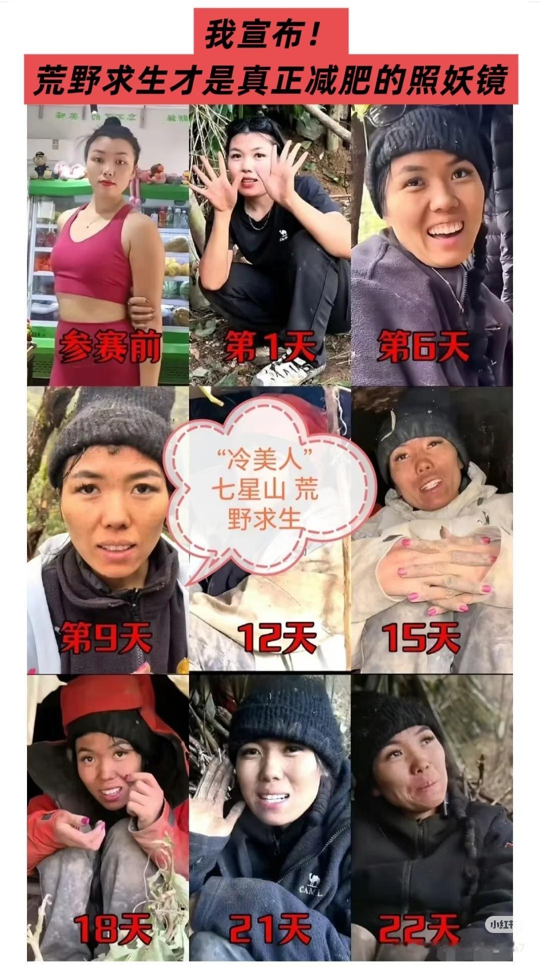 七星山荒野求生里的冷美人, 给全天下想挑战极限的普通人上了一课, 那就是环境再苦别慌,只要咬牙坚持,你就是全网最燃的生存者! 她参赛十几天就瘦成闪电,手指嘴唇开裂,现在34天了还在扛。生理期蜷缩一米高的山洞里,笑着说自己幸运没被雨淋,安全员问能不能坚持,她硬气说没问题。 她从普通女孩变成荒野里的生存者,采野果先尝再吐,蝗虫塞口袋当蛋白质。最开始火被雨浇灭,重新点;庇护所只能趴着睡,也没喊过退。 你说这荒野里的坚持,不就是普通人最动人的生命力吗?