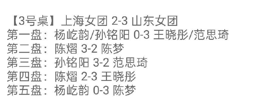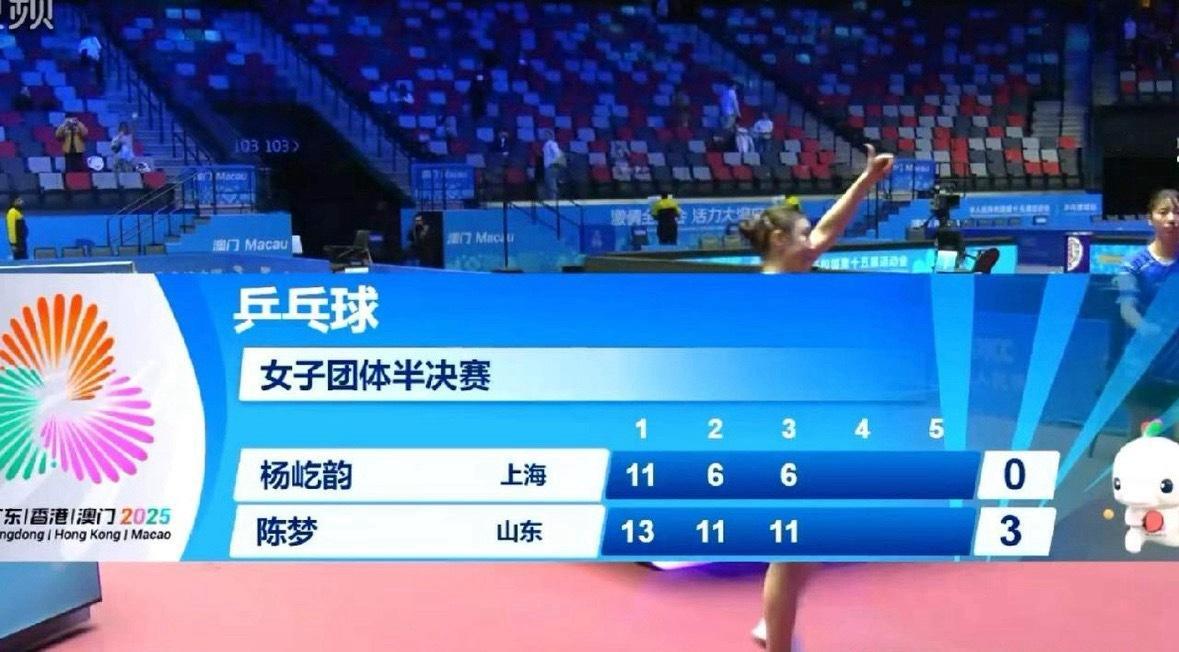 陈梦带山东女团进决赛,五盘比赛打了四个半小时。全运会半决赛,其他三场都是3-0结束,只有山东和上海女团打的如此艰难。除第一盘双打山东队3-0,最后一盘陈梦3-0,其他三盘都打满5局。陈梦输给陈熠,陈熠又输给王晓彤,最后一盘陈梦又遇削球手,打的难解难分,全场都没多少人了,裁判和工作人员在坚守。3-2陈梦带领山东女团打进决赛,真是没想到啊,陈梦全运会最大赢家,休赛一年复出单打铜牌,团体至少是银牌。今天上海队虽败犹荣,陈熠尽力了,五局比分都是二分之差,只是运气差了一点。图片来自网络侵权可删。