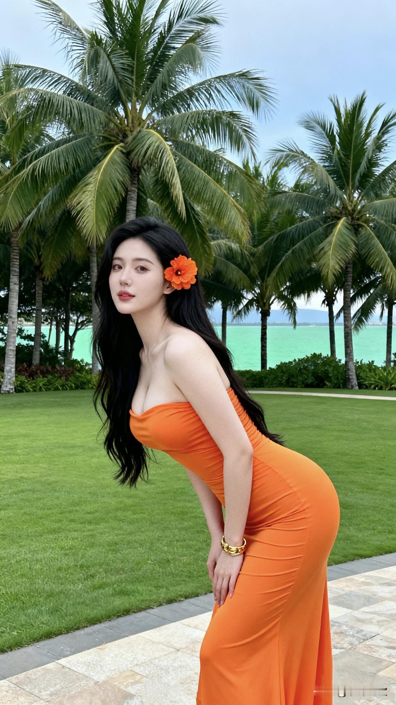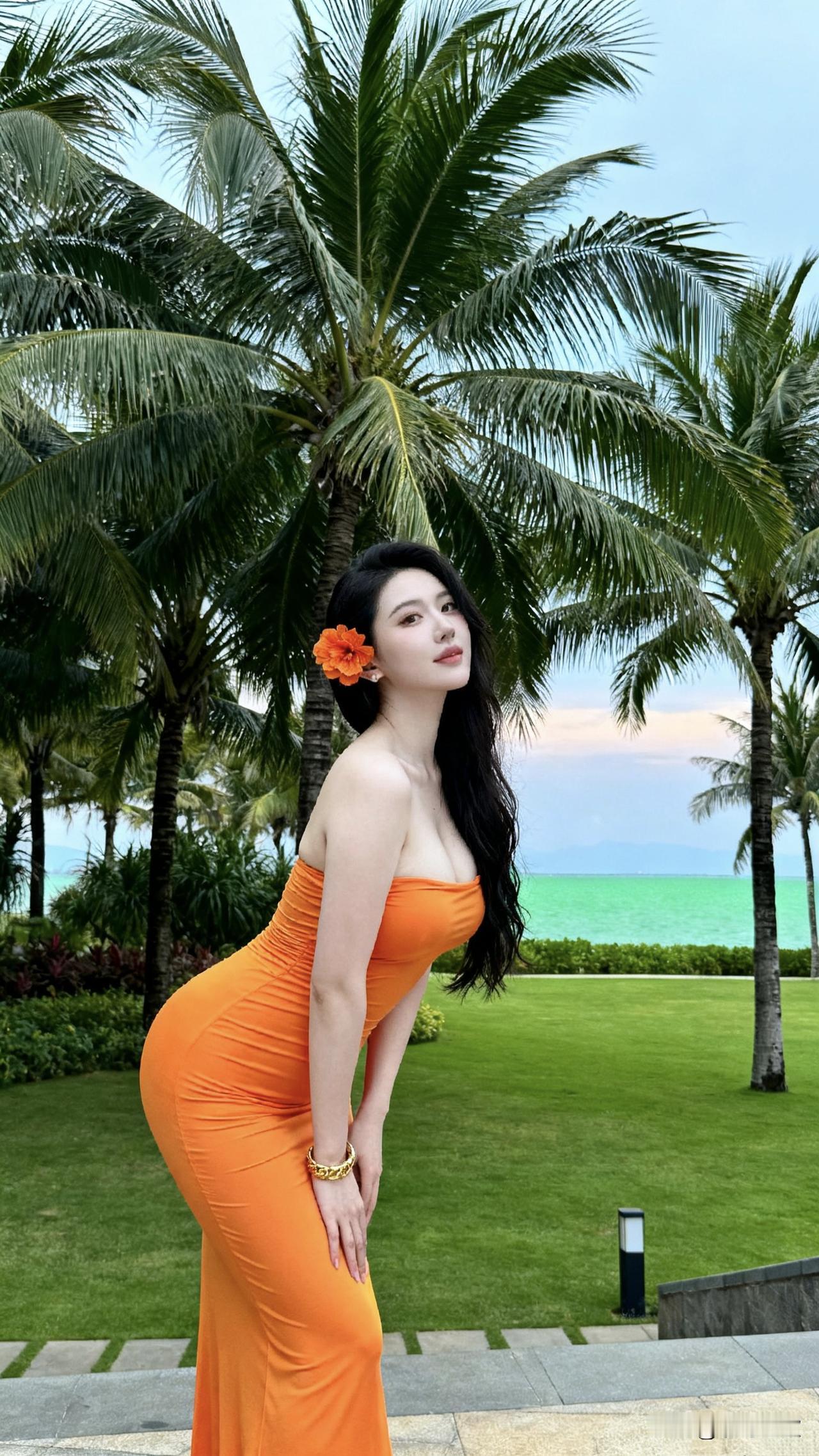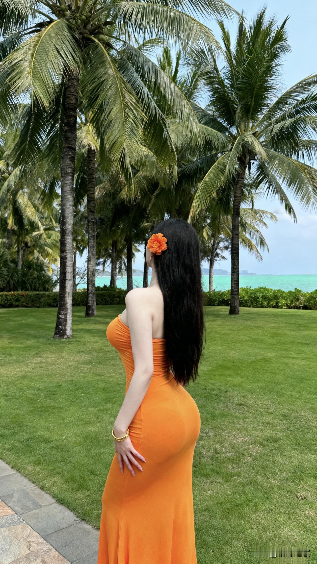 海边的风景真是赏心悦目啊!你看那蓝绿色的海水多清澈啊,跟玻璃似的!草坪修剪得整整齐齐的,几棵大棕榈树摇曳着,简直就是度假天堂。我穿着这条橙色长裙站在这里,感觉自己也成了风景的一部分。头上戴着花,长发飘飘的,海风轻轻吹过,那种惬意感真的没法形容。这种地方待着,什么工作烦恼都忘了,就想一直这么待下去,享受这份难得的悠闲时光!美女海边风景 海边度假气质 治愈系海滨风光 沙滩风景