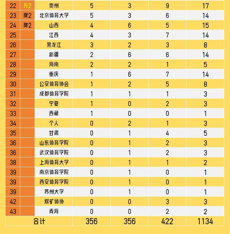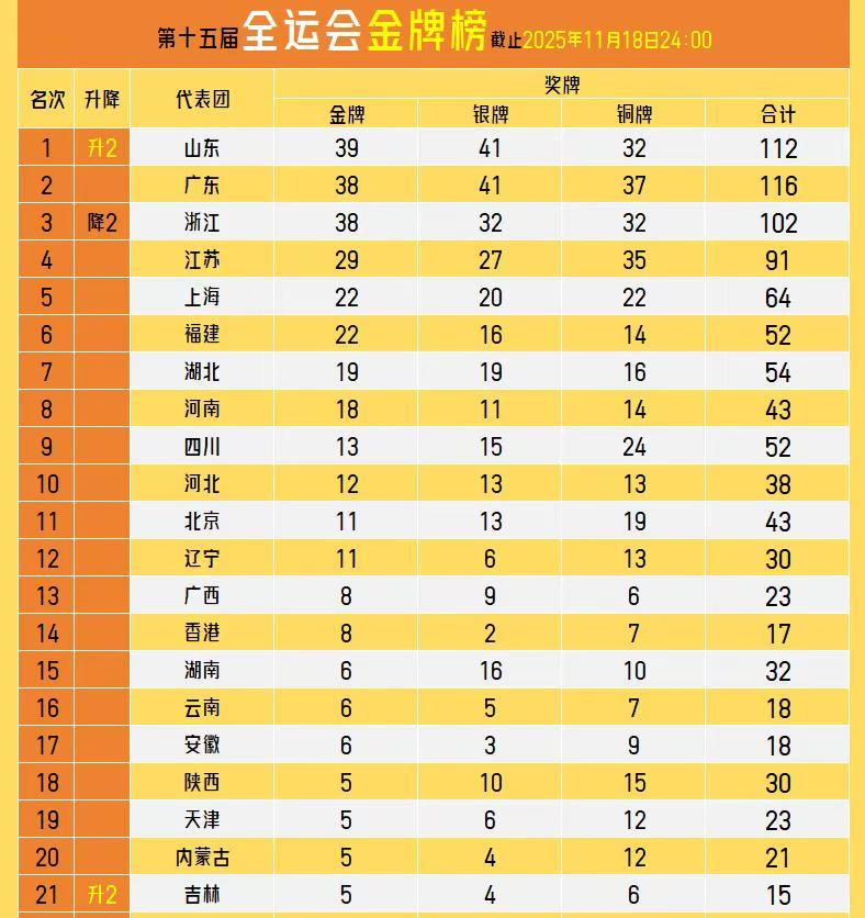 【山东18日入账3金2银1铜重回金牌榜榜首!广东金牌追平浙江,吉林贵州各升2位!】随着全运会进入后半程,比赛单日产生金牌数量在下降,11月18日共有18项比赛决出胜负,共计产生54枚奖牌。山东单日进账3金2银1铜,重回金牌榜榜首,广东金牌追平浙江,仍居奖牌榜第一。金牌榜前三竞争异常激烈!吉林和贵州各升2位,北体和山西各降2位。超过五枚金牌的代表团达到23个。