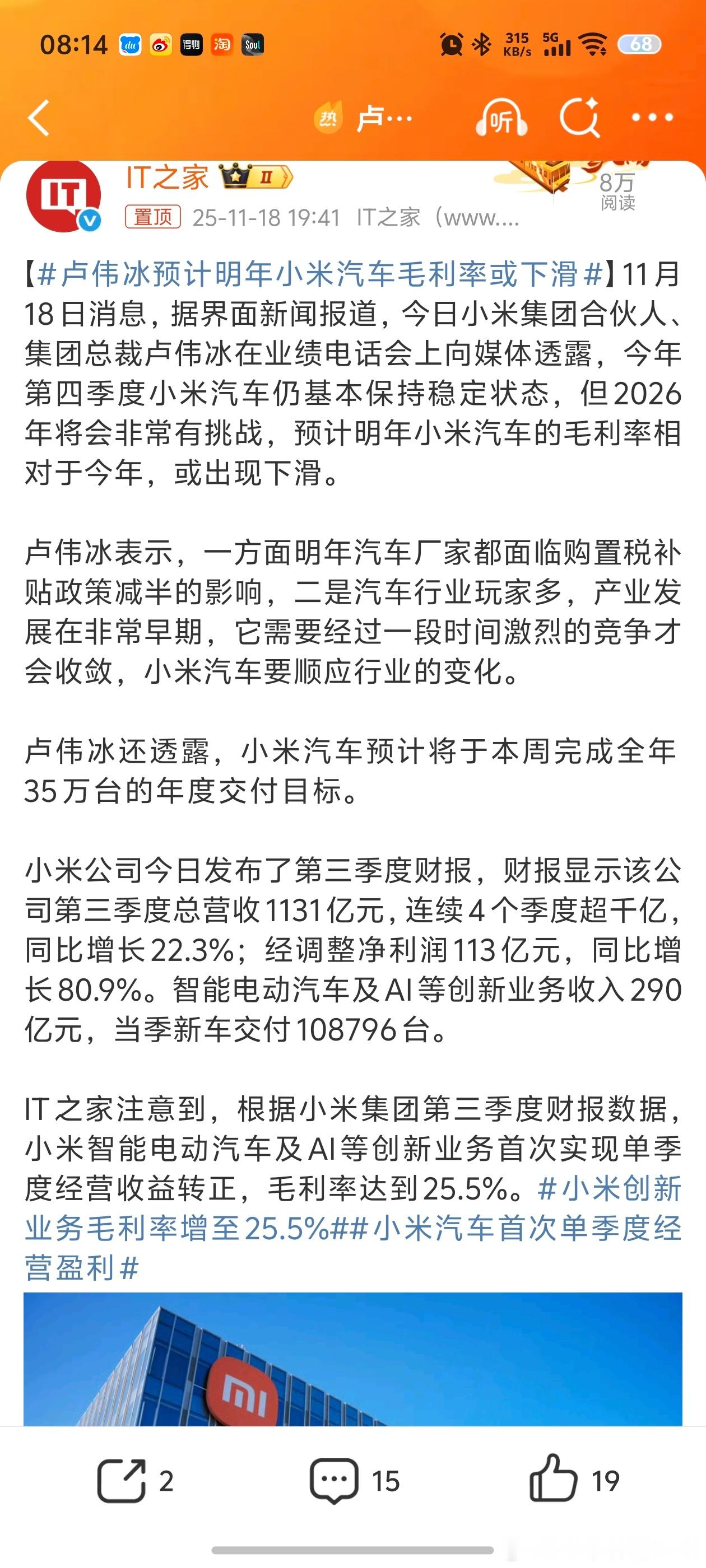 卢伟冰预测,明年小米汽车毛利率有可能会下滑,主要是因为购置税补贴政策减半,还有汽车行业竞争太过激烈。从目前的市场来看,卢伟冰说的还是有道理的。各大品牌都在努力,小米也不可能一直保持如今疯狂增长的势头,毛利率下滑属于正常的事情。