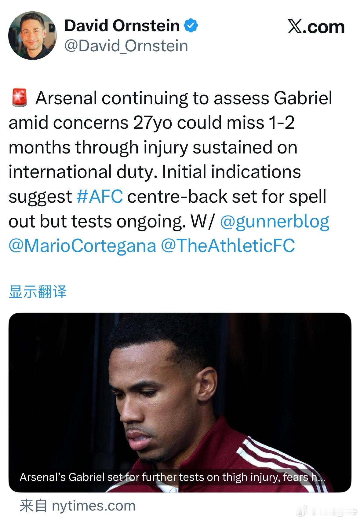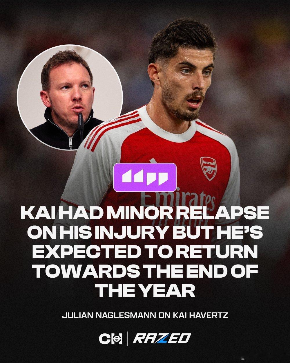 D.O:加布里埃尔还将继续接受检查,阿森纳担心他可能缺席1-2个月。德国主帅纳格尔斯曼:哈弗茨恢复过程遭遇波折,他可能年底才能复出。