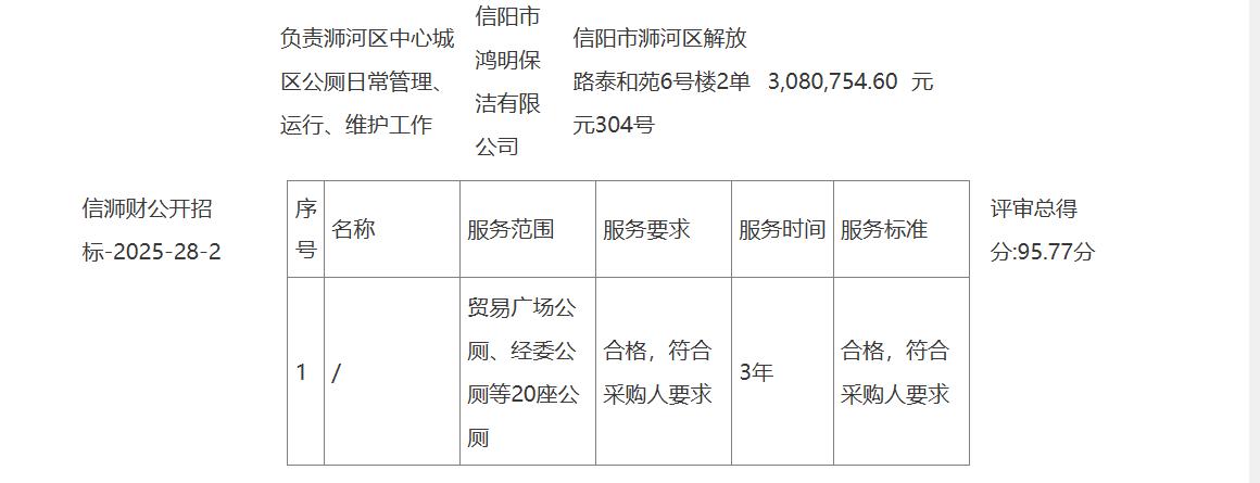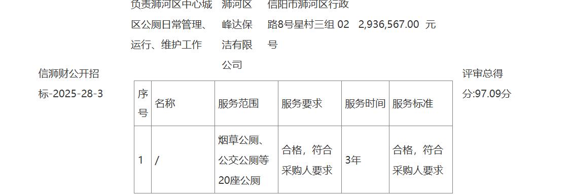 信阳市浉河区城市管理局浉河区中心城区公厕管理服务采购项目-中标公告,金额673万元