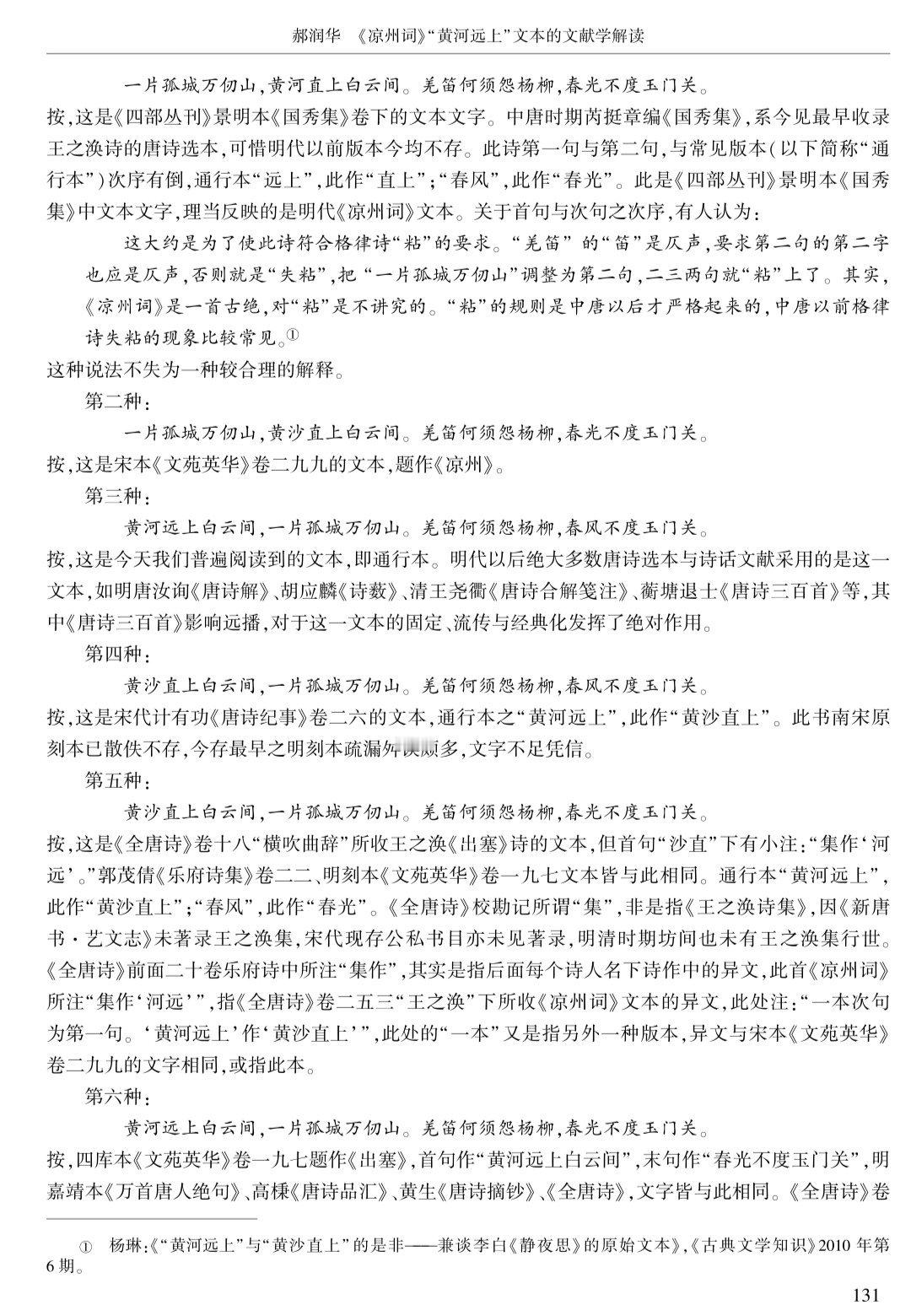 原本以为王之涣的代表作有两个版本:黄河远上白云间 vs 黄沙远上白云间。¹ 看这篇论文的文献整理,原来凉州词有9个版本!² 目前可及的最早版本是A:一片孤城万仞山,黄河远上白云间。羌笛何须怨杨柳,春光不度玉门关。³ B:一片孤城万仞山,黄沙远上白云间。羌笛何须怨杨柳,春光不度玉门关。C:黄河远上白云间,一片孤城万仞山。羌笛何须怨杨柳,春风不度玉门关。D:黄沙远上白云间,一片孤城万仞山。羌笛何须怨杨柳,春风不度玉门关。E:黄沙远上白云间,一片孤城万仞山。羌笛何须怨杨柳,春光不度玉门关。F:黄河远上白云间,一片孤城万仞山。羌笛何须怨杨柳,春光不度玉门关。G:黄河直上白云间,一片孤城万仞山。羌笛何须怨杨柳,春光不度玉门关。H:黄河远上白云间,一片孤城万仞山。羌笛何用怨杨柳,春风不度玉门关。I:黄沙远上白云间,一片孤城万仞山。羌笛何用怨杨柳,春风不度玉门关。⁴ 最大争议:是黄河还是黄沙,是春风还是春光。感觉还是黄河远上更合理。