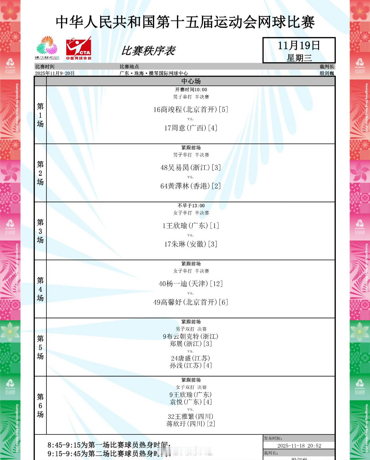 全运会网球今日赛程10:00 商竣程vs周意随后 吴易昺vs黄泽林随后 王欣瑜vs朱琳随后 杨一迪vs高馨妤随后 布云朝克特/郑展vs孙浅/唐盛 (❗️决赛)随后 王欣瑜/袁悦vs蒋欣玗/王雅繁 (❗️决赛)