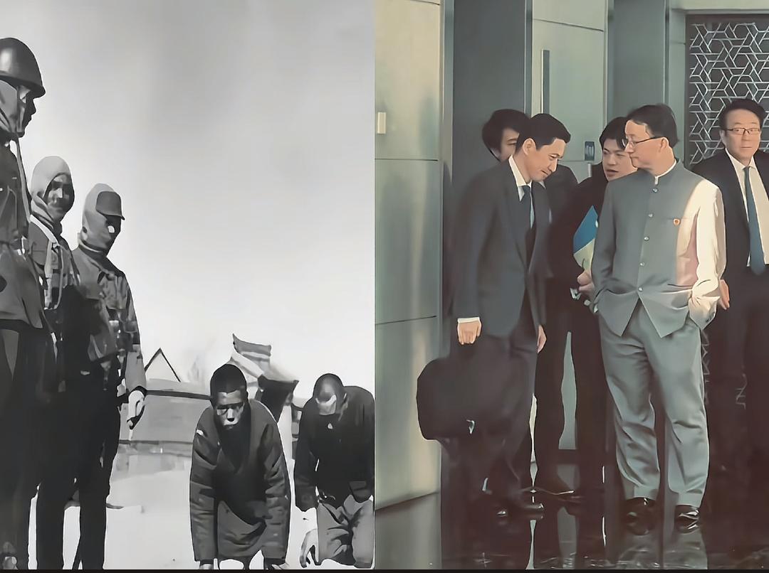 中山装,挂国徽 双手插兜训老龟 斥倭寇,振国威 扬眉吐气等台归