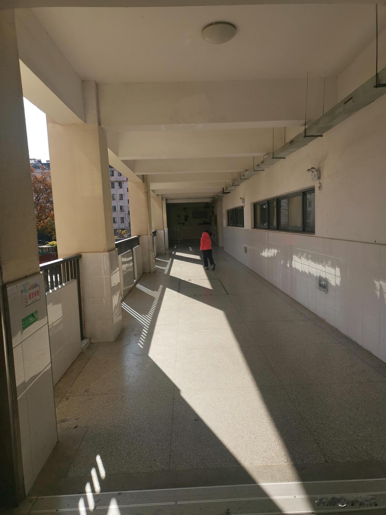 晒图笔记大赛课间,一个人奔跑在阳光照耀的走廊上