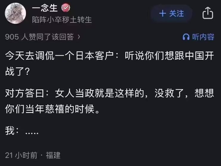 日本人竟然把早苗比作当年的慈禧, 难道日本人也有:某某当家,房倒屋塌? 对于这名日本人的看法,只能说也只是一个注解。反正博主看来,想让这位早苗收回言论,比较困难,因为这人一看就是自虐狂和偏执狂。说出去的话,坚决不肯收回,哪怕是刀架在脖子上,估计也是不愿意收回,因为早就已经彻底的疯狂了。 早苗经过一辈子受到的教育和思想,都已经被禁锢了,怎么无论如何,是不肯收回的。所以说遇到一个这样的偏执狂,你没法讲道理,你这次不给她压住,下次还会有更出格的言论出来。 对于早苗这样的言论,博主也是毫不意外,毕竟很大一部分的右翼,还是沉迷在以前的所谓的荣光里。根本不相信世界的变化,你要跟他们说咱们的军事实力,比日本强大多,他们打死都不信。