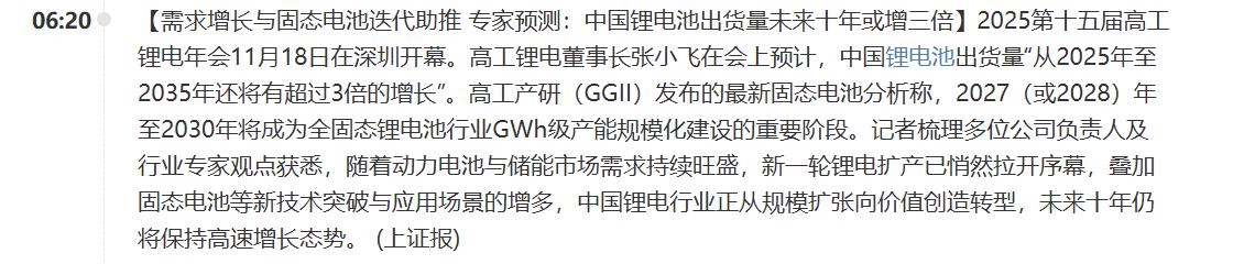锂电大利好!未来十年还有超3倍的需求空间?那这确定性不是杠杠的吗? 2025第十五届高工锂电年会上,高工锂电董事长张小飞在会上预计,中国锂电池出货量“从2025年至2035年还将有超过3倍的增长”。高工产研(GGII)发布的最新固态电池分析称,2027(或2028)年至2030年将成为全固态锂电池行业GWh级产能规模化建设的重要阶段。 大家看高工锂电董事长的这个表态,是不是对于锂电产业链而言是重量级利好? 未来十年锂电池出货量还有将超3倍的增长,那未来体量得有多大?固态电池2027年开始产能规模化,那还要什么油车? 只要固态电池技术日益成熟,成本问题不断解决,我相信未来电车直接由市场化的方式取代油车,必然是大势所趋! 固态电池充电效率,衰减程度,安全性能都将大幅碾压现在的液体电池。到时充换电和加油一样,但是成本却更低,那么作为消费者而言,买车选什么呢? 我想答案不言而喻! 所以未来锂电产业链的高景气度是有保障的,因此,大家不要被昨天的调整所吓跑了!